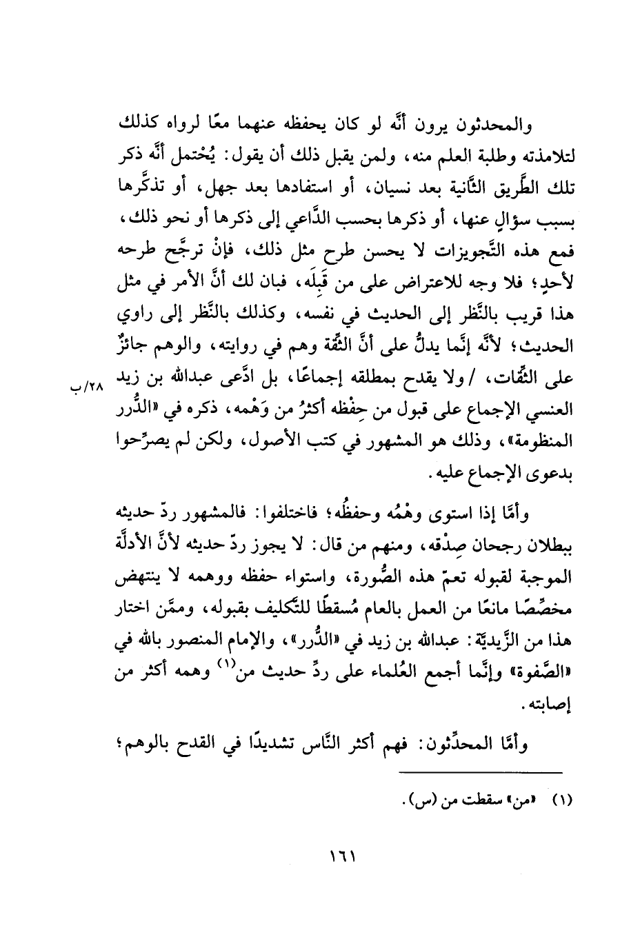 والمحدّثون يرون أنّه لو كان يحفظه عنهما معاً لرواه كذلك لتلامذته وطلبة العلم منه, ولمن يقبل ذلك أن يقول: يحتمل أنّه ذكر تلك الطّريق الثّانية بعد نسيان, أو استفادها بعد جهل, أو تذكّرها بسبب سؤال عنها, أو ذكرها بحسب الدّاعي إلى ذكرها أو نحو ذلك, فمع هذه التّجويزات لا يحسن طرح مثل ذلك, فإن ترجّح طرحه لأحد؛ فلا وجه للاعتراض على من قبله, فبان لك أنّ الأمر في مثل هذا قريب النظر إلى الحديث في نفسه, وكذلك النّظر إلى راوي الحديث؛ لأنّه إنّما يدلّ على أنّ الثّقة وهم في روايته, والوهم جائز على الثّقات, /ولايقدح بمطلقه إجماعاً, بل ادّعى عبد الله بن زيد العنسي الإجماع على قبول حفظه أكثر من وهمه, ذكره في ((الدّرر المنظومة)) , وذلك هو المشهور في كتب الأصول, ولكن لم يصرّحوا بدعوى الإجماع عليه.