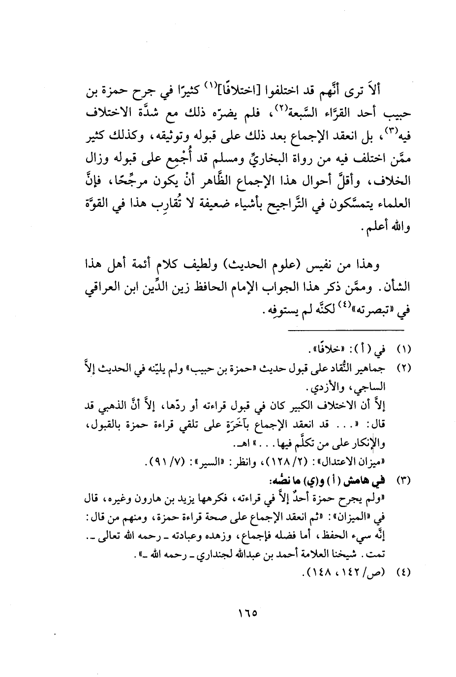 ((ولم يجرح حمزة أحد إلا في قراءته, فكرهها يزيد بن هارون وغيره, قال في ((الميزان)): ((ثمّ انعقد الإجماع على صحة قراءة حمزة, ومنهم من قال: إنّه سيء الحفظ, أما فضله فإجماع, وزهده وعبادته -رحمه الله تعالى-)). تمت. شيخنا العلامة أحمد بن عبد الله لجنداري -رحمه الله-)).