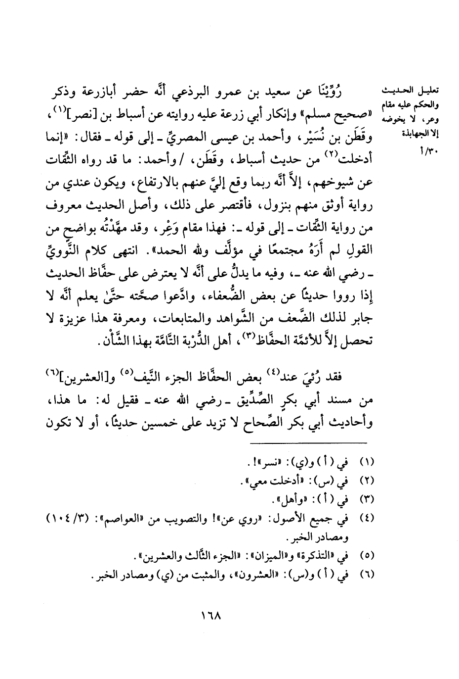 رُوّينا عن سعيد بن عمرو البرذعي أنّه حضر أبا زرعة وذكر ((صحيح مسلم)) وإنكار أبي زرعة عليه روايته عن أسباط بن [نصر] (¬1) , وقطن بن نسير, وأحمد بن عيسى المصريّ -إلى قوله- فقال: ((إنّما أدخلت (¬2) من حديث أسباط, وقطن, /أحمد: ما قد رواه الثّقات عن شيوخهم, إلا أنّه ربما وقع إليّ عنهم بالارتفاع, ويكون عندي من رواية أوثق منهم بنزول, فأقتصر على ذلك, وأصل الحديث معروف من رواية الثّقات-إلى قوله-: فهذا مقام وعر, وقد مهّدته بواضح من القول لم أره مجتمعاً في مؤلف ولله الحمد)). انتهى كلام النّوويّ - رضي الله عنه - , وفيه ما يدلّ على أنّه لا يعترض على حفّاظ الحديث إذا رووا حديثاً عن بعض الضّعفاء, وادّعوا صحّته حتّى يعلم أنّه لا جابر لذلك الضّعف من الشّواهد والمتابعات, ومعرفة هذا عزيزة لا تحصل إلا للأئمّة الحفّاظ (¬3) , أهل الدّربة التّامّة بهذا الشأن.