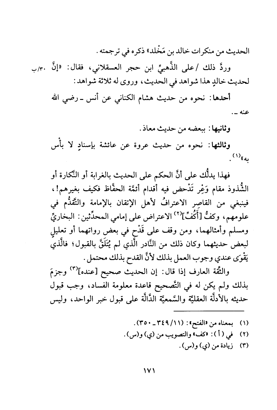 وردّ ذلك /على الذّهبيّ ابن حجر العسقلاني, فقال: ((إنّ لحديث خالد هذا شواهد في الحديث, وروى له ثلاثة شواهد: