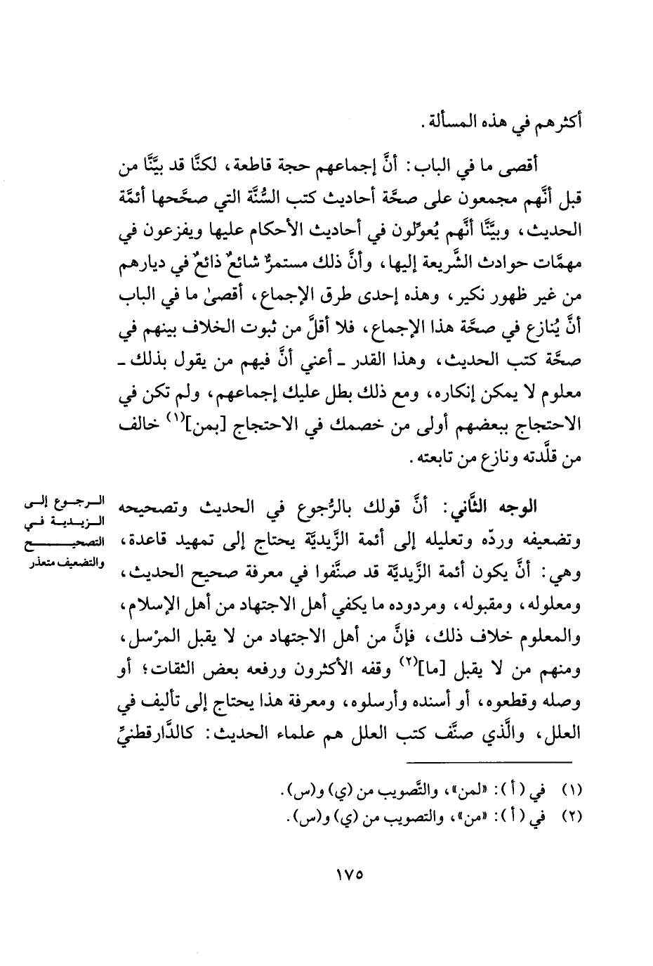 الوجه الثّاني: أنّ قولك بالرّجوع في الحديث وتصحيحه وتضعيفه وردّه وتعليله إلى أئمة الزّيديّة يحتاج إلى تمهيد قاعدة, وهي: أنّ يكون أئمة الزّيديّة قد صنّفوا في معرفة صحيح الحديث, ومعلومه, ومقبوله, ومردوده ما يكفي أهل الاجتهاد من أهل الإسلام, والمعلوم خلاف ذلك, فإنّ من أهل الاجتهاد من لا يقبل المرسل, ومنهم من لا يقبل [ما] (¬2) وقفه الأكثرون ورفعه بعض الثّقات؛ أو وصله وقطعوه, أو أسنده وأرسلوه, ومعرفة هذا يحتاج إلى تأليف في العلل, والذي كتب العلل هم علماء الحديث: كالدّارقطنيّ