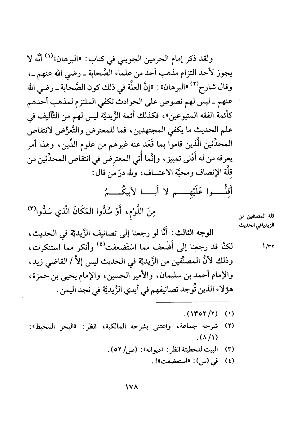 ولقد ذكر إمام الحرمين الجويني في كتاب ((البرهان)) (¬1) أنّه لا يجوز لأحد التزام مذهب أحد من علماء الصّحابة -رضي الله عنهم-, وقال شارح (¬2) ((البرهان)): ((إنّ العلّة في ذلك كون الصّحابة -رضي الله عنهم- ليس لهم نصوص على الحوادث تكفي الملتزم لمذهب أحدهم كأئمة الفقه المتبوعين)) , فكذلك أئمة الزّيديّة ليس لهم من التّأليف في علم الحديث ما يكفي المجتهدين, فما للمعترض والتّعرّض لانتقاص المحدّثين الذين قاموا بما قعد عنه غيرهم من علوم الدّين, وهذا أمر يعرفه من له أدنى تمييز, وإنّما أُتي المعترض في انتقاض المحدّثين من قلّة الإنصاف ومحبّة الاعتساف, ولله درّ من قال: