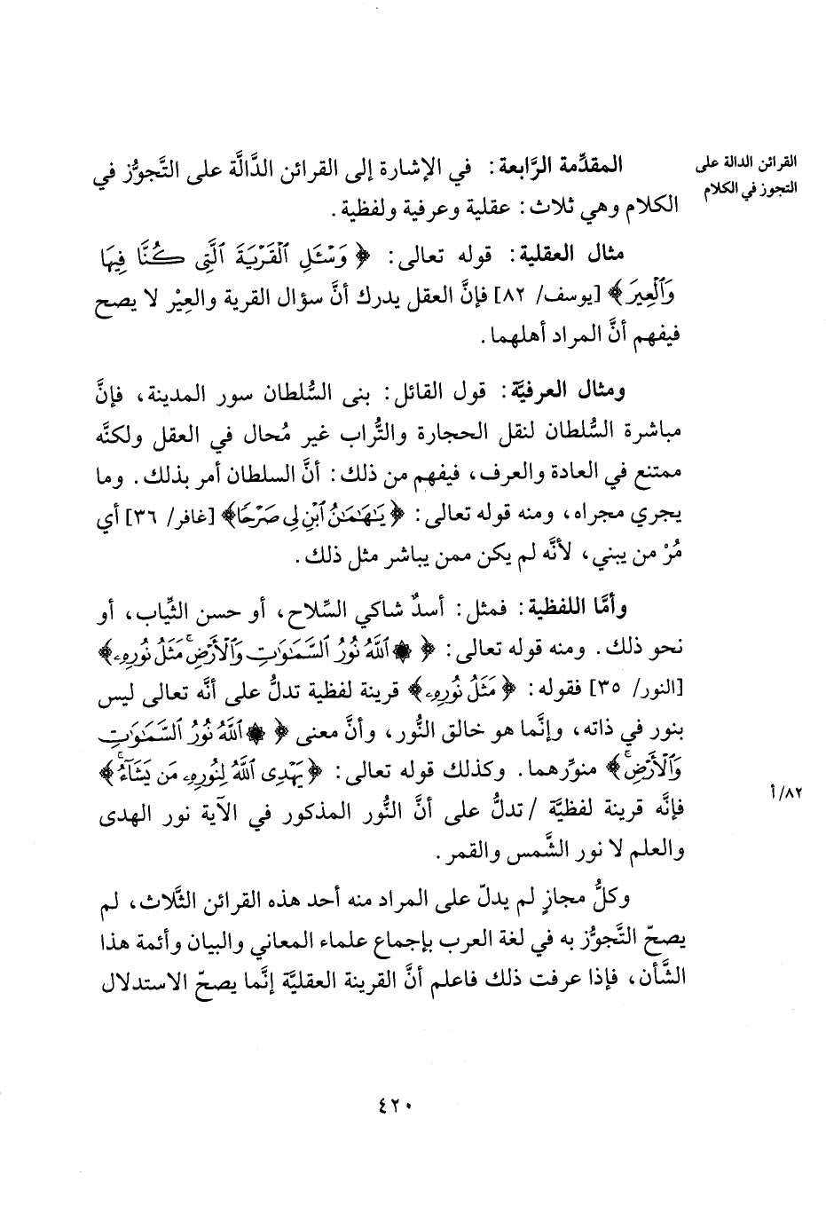 وأمّا اللّفظية: فمثل: أسد شاكي السّلاح, أو حسن الثّياب, أو نحو ذلك. ومنه قوله تعالى: ((الله نور السماوات والأرض مثل نوره)) [النور/35] فقوله: ((مثل نوره)) قرينة لفظية تدلّ على أنّه تعالى ليس بنور في ذاته, وإنّما هو خالق النّور, وأنّ معنى ((الله نور السماوات والأرض)) منوّرهما. وكذلك قوله تعالى: ((يهدي الله لنوره من يشاء)) فإنّه قرينة لفظية /تدلّ على أنّ النّور المذكور في الآية نور الهدى والعلم لا نور الشّمس والقمر.
