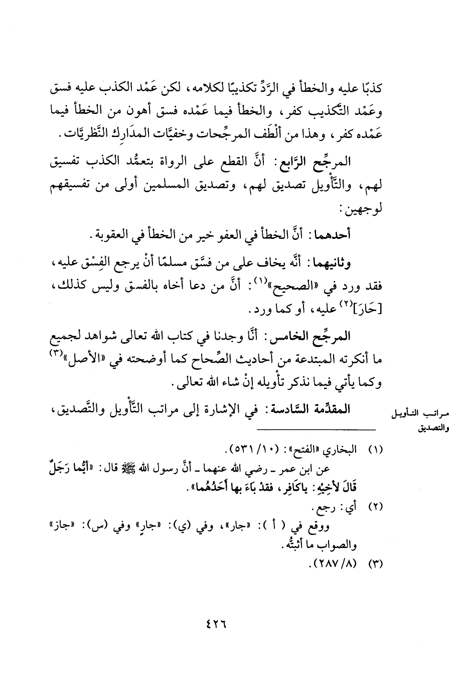كذباً عليه والخطأ في الرّدّ تكذيباً لكلامه, لكن عمد الكذب عليه فسق وعمد التّكذيب كفر, والخطأ فيما عمده كفر, وهذا من ألطف المرجّحات وخفيّات المدارك النّظريّات.