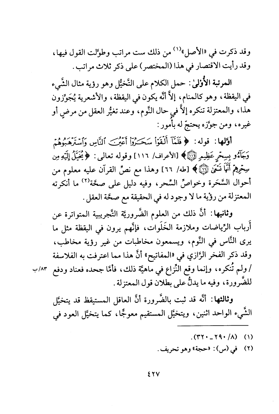 وثانيها: أنّ ذلك من العلوم الضّرورية التّجريبيّة المتواترة عن أرباب الرّياضيات وملازمة الخلوات, فإنّهم يرون في اليقظة مثل ما يرى النّاس في النّوم, ويسمعون مخاطبات من غير رؤية مخاطب, وقد ذكر الفخر الرّازي في ((المفاتيح)) أنّ هذا مما اعترفت به الفلاسفة / ولم تنكره, وإنما وقع النّزاع في ماهيّة ذلك, فأمّا جحده فعناد ودفع للضّرورة, وفيه ما يدلّ على بطلان قول المعتزلة.
