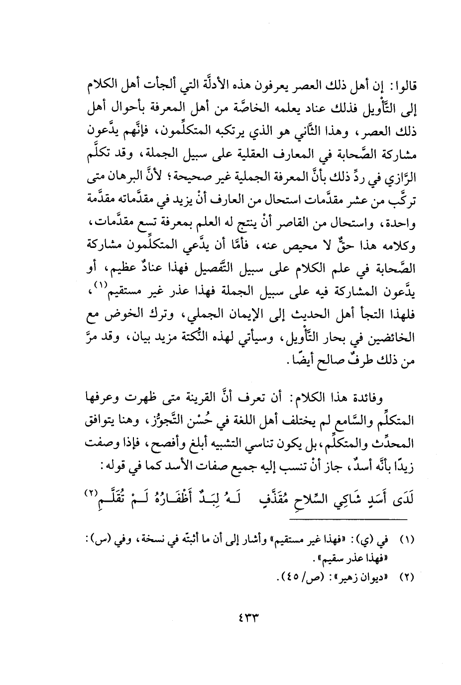 قالوا: إن أهل ذلك العصر يعرفون هذه الأدلّة التي ألجأت أهل الكلام إلى التّأويل فذلك عناد يعلمه الخاصّة من أهل ذلك العصر, وهذا الثّاني هو الذي يركبه المتكلّمون, فإنّهم يدّعون مشاركة الصّحابة في المعارف العقلية على سبيل الجملة, وقد تكلّم الرّازي في ردّ ذلك بأنّ المعرفة الجملية غير صحيحة؛ لأنّ البرهان متى تركّب من عشر مقدّمات استحال من العارف أن يزيد في مقدّماته مقدّمة واحدة, واستحال من القاصر أن ينتج له العلم بمعرفة تسع مقدّمات, وكلامه هذا حقّ لا محيص عنه, فأمّا أن يدّعي المتكلّمون مشاركة الصّحابة في علم الكلام على سبيل التفصيل فهذا عناد عظيم, أو يدّعون المشاركة فيه على سبيل الجملة فهذا عذر غير مستقيم (¬1) , فلهذا التجأ أهل الحديث إلى الإيمان الجملي, وترك الخوض مع الخائضين في بحار التّأويل, وسيأتي لهذه النّكتة مزيد من بيان, وقد مرّ من ذلك طرف صالح أيضاً.