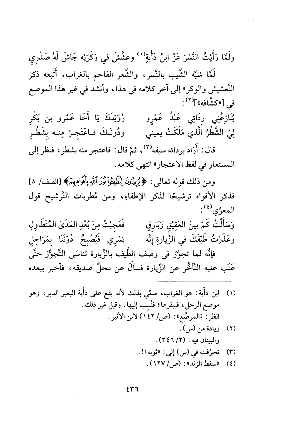 لمّا شبّه الشّيب بالنّسر, والشّعر الفاحم بالغراب, أتبعه ذكر التّعشيش والوكر)) إلى آخر كلامه في هذا, وأنشد في غير هذا الموضع في [((كشّافه))] (¬2):