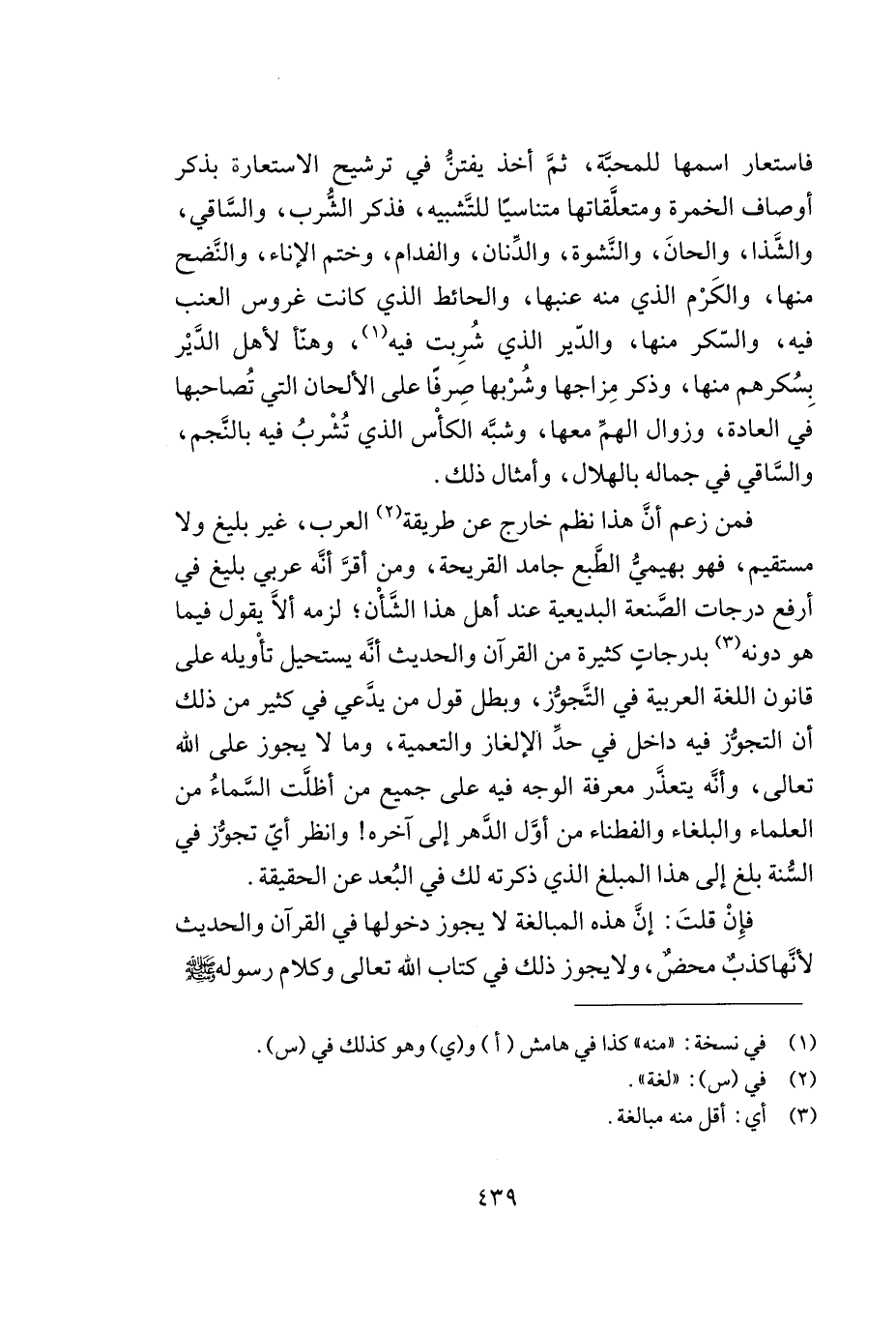 فمن زعم أنّ هذا نظم خارج عن طريقة (¬2) العرب, غير بليغ ولا مستقيم, فهو بهيميّ الطبع جامد القريحة, ومن أقرّ أنّه عربي بليغ في أرفع درجات الصّنعة البديعية عند أهل هذا الشّأن؛ لزمه ألا يقول فيما هو دونه (¬3) بدرجات كثيرة من القرآن والحديث أنّه يستحيل تأويله على قانون اللغة العربية في التّجوّز, وبطل قول من يدّعي في كثير من ذلك أن التّجوّز فيه داخل في حدّ الإلغاز والتعمية, وما لا يجوز على الله تعالى, وأنّه يتعذّر معرفة الوجه فيه على جميع من أظلّت السّماء من العلماء والبلغاء والفطناء من أوّل الدّهر إلى آخره! وانظر أيّ تجوّز في السّنّة بلغ إلى هذا المبلغ الذي ذكرته لك في البعد عن الحقيقة.