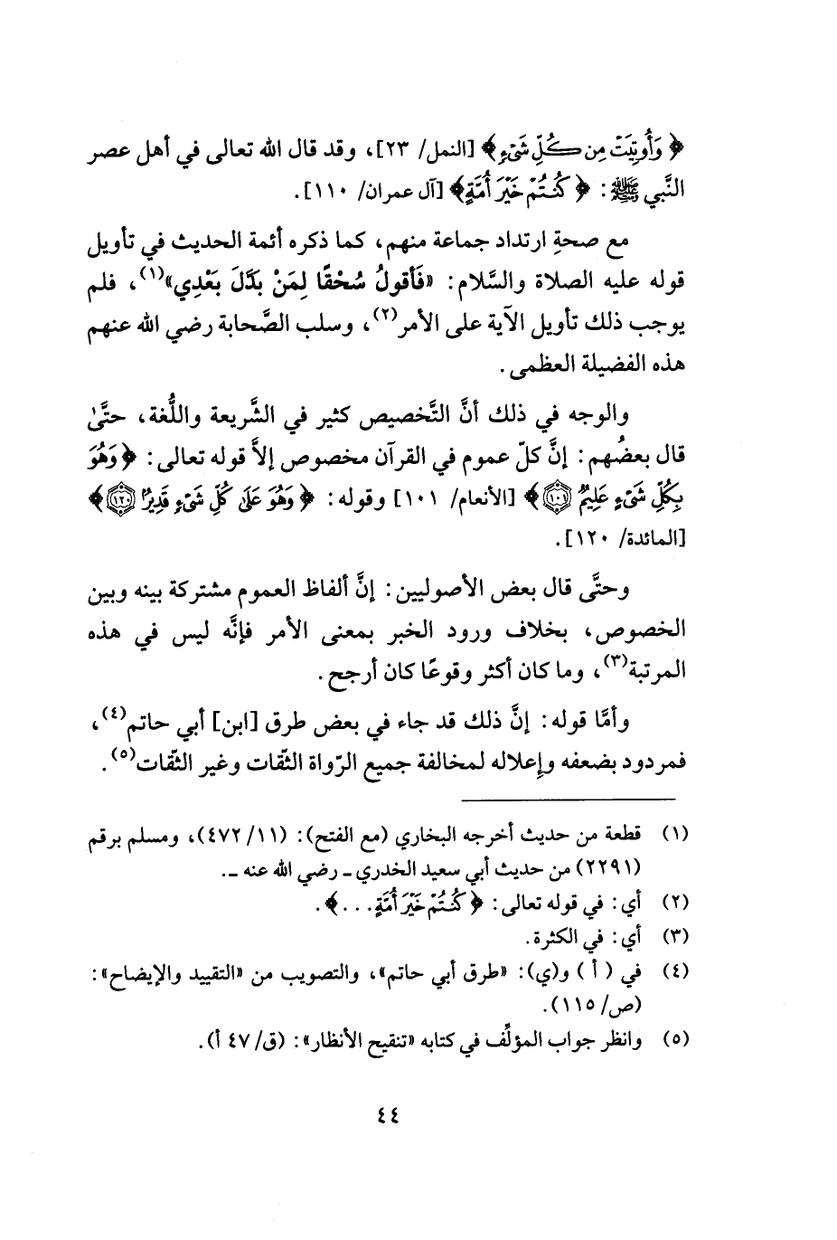 مع صحة ارتداد جماعة منهم, كما ذكره أئمة الحديث في تأويل قوله عليه الصلاة والسلام: ((فأقول سحقاً لمن بدّل بعدي)) (¬1) , فلم يوجب ذلك تأويل الآية على الأمر (¬2) , وسلب الصّحابة رضي الله عنهم هذه الفضيلة العظمى.