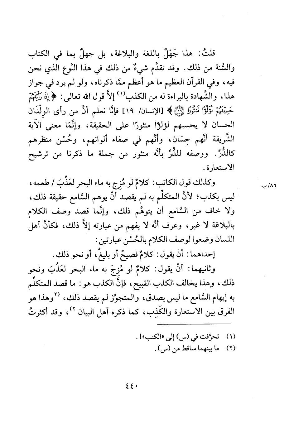 قلت: هذا جهل باللغة والبلاغة, بل جهل بما في الكتاب والسّنة من ذلك. وقد تقدّم شيء من ذلك في هذا النّوع الذي نحن فيه, وفي القرآن العظيم ما هو أعظم ممّا ذكرناه, ولو لم يرد في جواز هذا, والشّهادة بالبراءة له من الكذب (¬1) إلا قول الله تعالى: ((إذا رأيتهم حسبتهم لؤلؤاً منثوراً)) [الإنسان/19] فإنّا نعلم أنّ من رأى الولدان الحسان لا يحسبهم لؤلؤاً منثوراً في صفاء ألوانهم, وحسن منظرهم كالدّرّ. ووصفه للدّرّ بأنّه منثور من جملة ما ذكرنا من ترشيح الاستعارة.