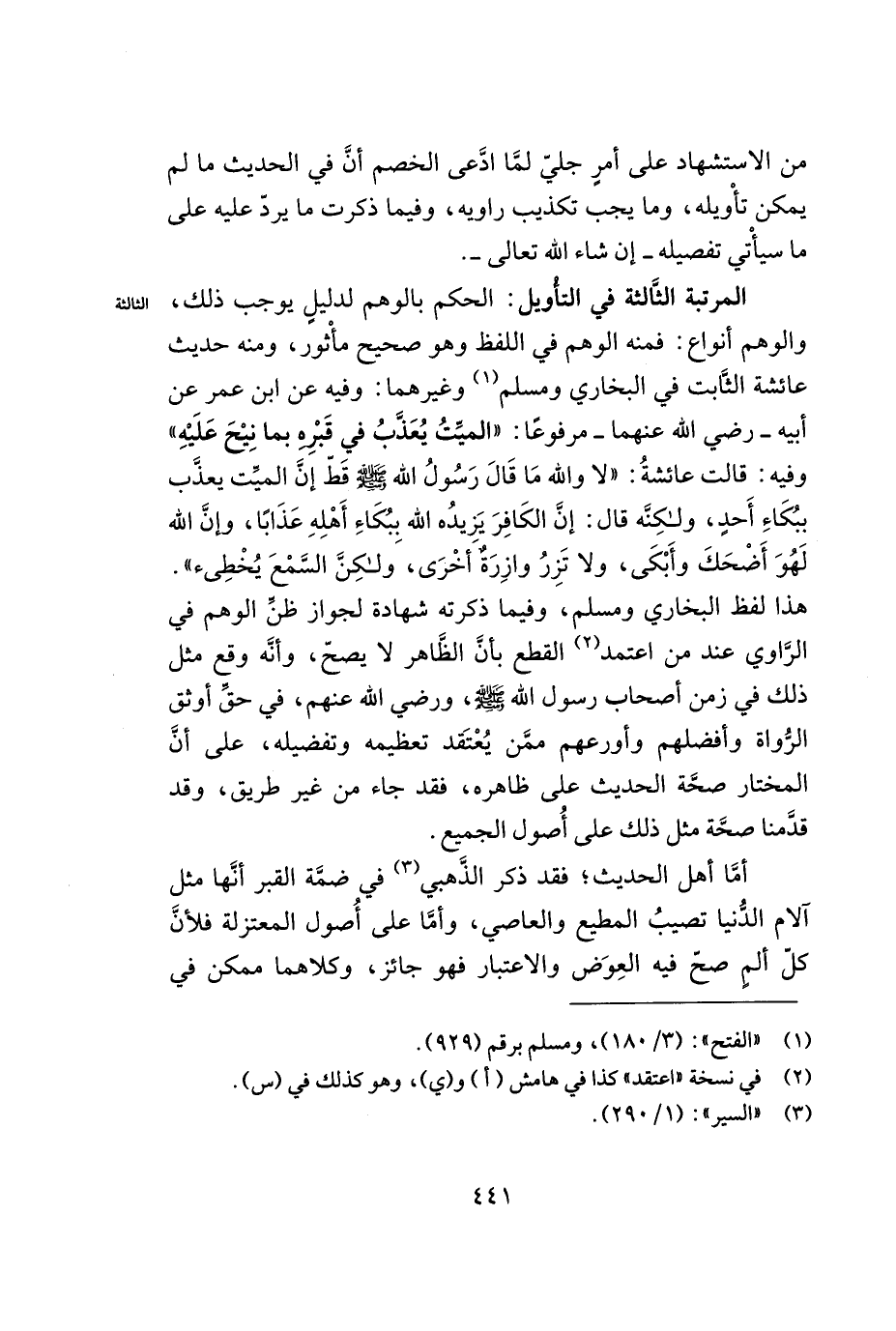المرتبة الثالثة في التّأويل: الحكم بالوهم لدليل يوجب ذلك, والوهم أنواع: فمنه الوهم في اللفظ وهو صحيح مأثور, ومنه حديث عائشة الثّابت في البخاري ومسلم (¬1) وغيرهما: وفيه عن ابن عمر عن أبيه -رضي الله عنهما- مرفوعاً: ((الميّت يعذّب في قبره بما نيح عليه)) وفيه: قالت عائشة: ((لا والله ما قال رسول الله - صلى الله عليه وسلم - قط إنّ الميّت يعذّب ببكاء أحد, ولكنّه قال: إنّ الكافر يزيده الله ببكاء أهله عذاباً, وإنّ الله لهو أضحك وأبكى, ولا تزر وازرة وزر أخرى, ولكنّ السّمع يخطىء)). هذا لفظ البخاري ومسلم, وفيما ذكرته شهادة لجواز ظنّ الوهم في الرّاوي عند من اعتمد (¬2) القطع بأنّ الظّاهر لا يصحّ, وأنّه وقع مثل ذلك في زمن أصحاب رسول الله - صلى الله عليه وسلم - , ورضي الله عنهم, في حقّ أوثق الرّواة وأفضلهم وأروعهم ممّن يُعتقد تعظيمه وتفضيله, على أنّ المختار صحّة مثل ذلك على أصول الجميع.