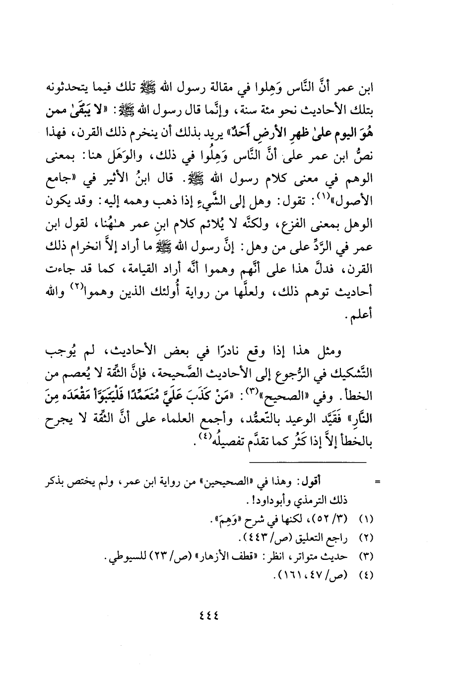 ومثل هذا إذا وقع نادر في بعض الأحاديث, لم يوجب التّشكيك في الرّجوع إلى الأحاديث الصّحيحة, فإنّ الثّقة لا يعصم من الخطأ. وفي ((الصّحيح)) (¬3): ((من كذب عليّ متعمّداً فليتبوّأ مقعده من النّار)) فقيّد الوعيد بالتّعمّد, وأجمع العلماء على أنّ الثّقة لا يجرح بالخطأ إلا إذا كثر كما تقدّم تفصيله (¬4).