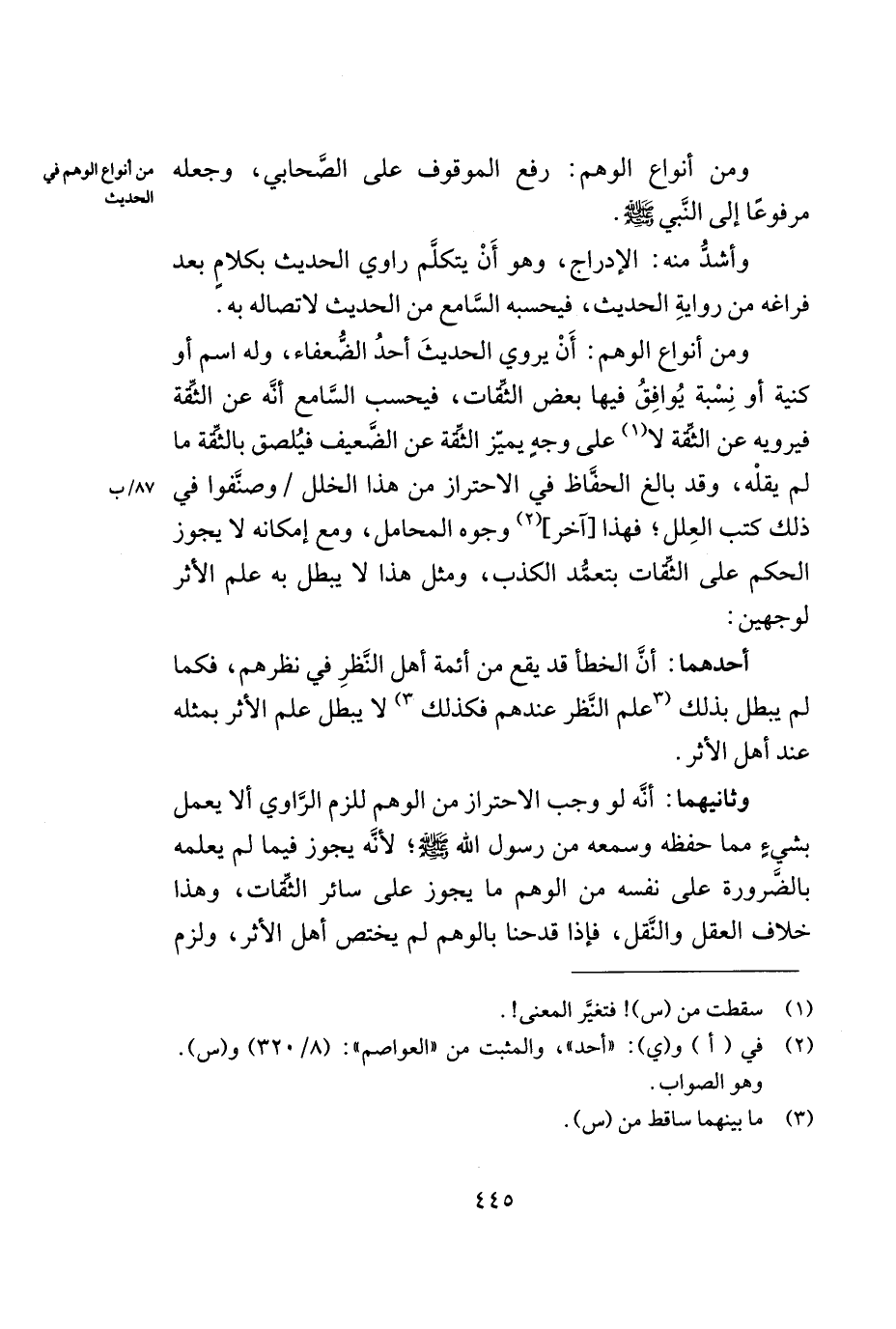 وثانيهما: أنّه لو وجب الاحتراز من الوهم للزم الرّاوي ألا يعمل بشيء مما حفظه وسمعه من رسول الله - صلى الله عليه وسلم - , لأنّه يجوز فيما لم يعلمه بالضّرورة على نفسه من الوهم ما يجوز على سائر الثّقات, وهذا خلاف العقل والنّقل, فإذا قدحنا بالوهم لم يختص أهل الأثر, ولزم