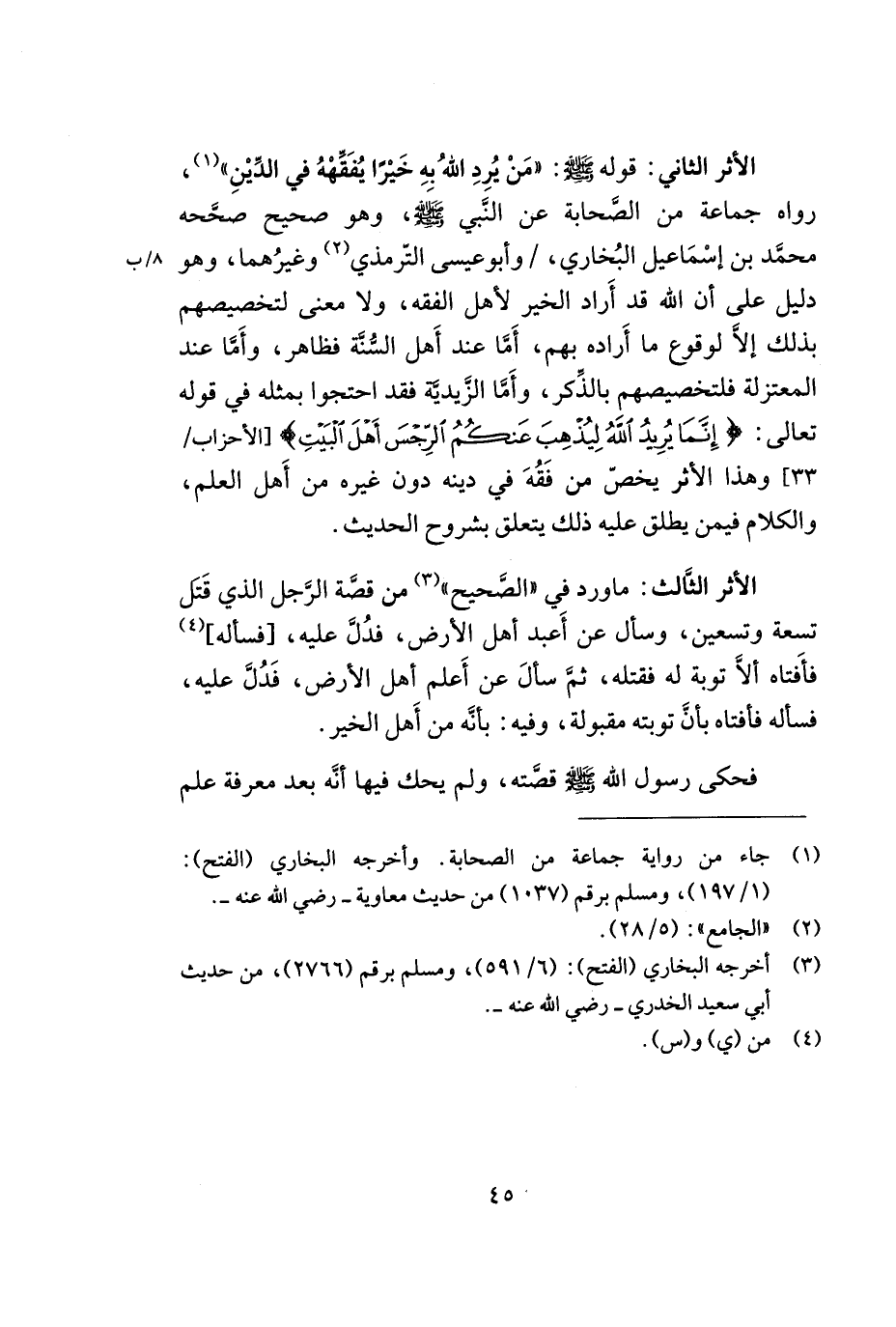 الأثر الثاني: قوله - صلى الله عليه وسلم -: ((من يرد الله به خيراً يفقّهه في الدّين)) (¬1) , رواه جماعة من الصّحابة عن النبي - صلى الله عليه وسلم - , وهو صحيح صحّحه محمد بن إسماعيل البخاري, / وأبو عيسى الترمذي (¬2) وغيرهما, وهو دليل على أن الله قد أراد الخير لأهل الفقه, ولا معنى لتخصيصهم بذلك إلا لوقوع ما أراده بهم, أمّا عند أهل السنة فظاهر, وأمّا عند المعتزلة فلتخصيصهم بالذّكر, وأمّا الزّيدية فقد احتجوا بمثله في قوله تعالى: {إِنَّمَا يُرِيدُ اللهُ لِيُذْهِبَ عَنكُمُ الرِّجْسَ أَهْلَ البَيتِ وَيُطَهِّرَكُم تَطْهِيراً} [الأحزاب:33].وهذا الأثر يخصّ من فقه في دينه دون غيره من أهل العلم, والكلام فيمن يطلق عليه ذلك يتعلق بشروح الحديث.