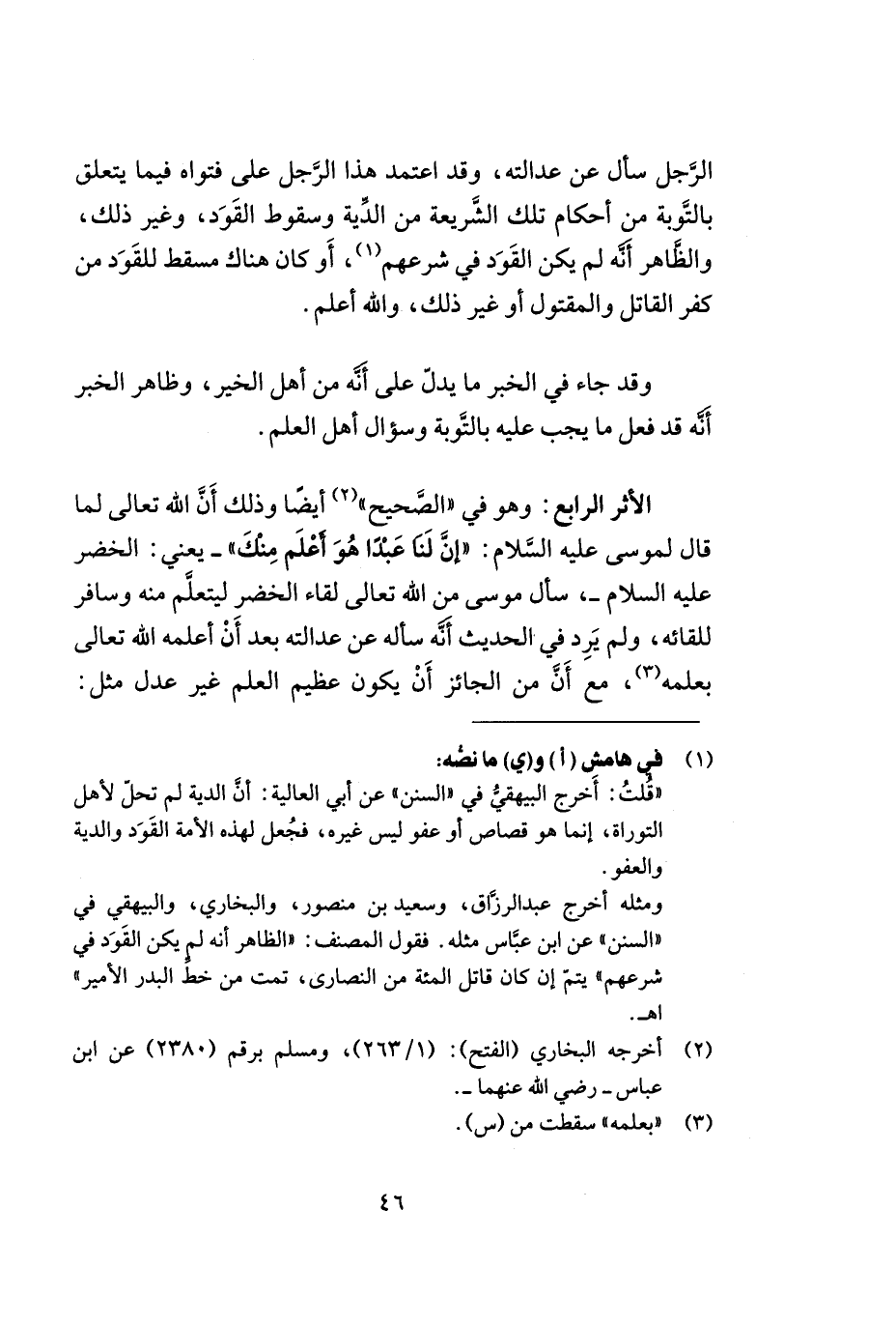 الرّجل سأل عن عدالته, وقد اعتمد هذا الرّجل على فتواه فيما يتعلق بالتّوبة من أحكام تلك الشّريعة من الدّية وسقوط القود, وغير ذلك, والظّاهر أنّه لم يكن القود في شرعهم (¬1) , أو كان هناك مسقط للقود من كفر القاتل والمقتول أو غير ذلك, والله أعلم.
