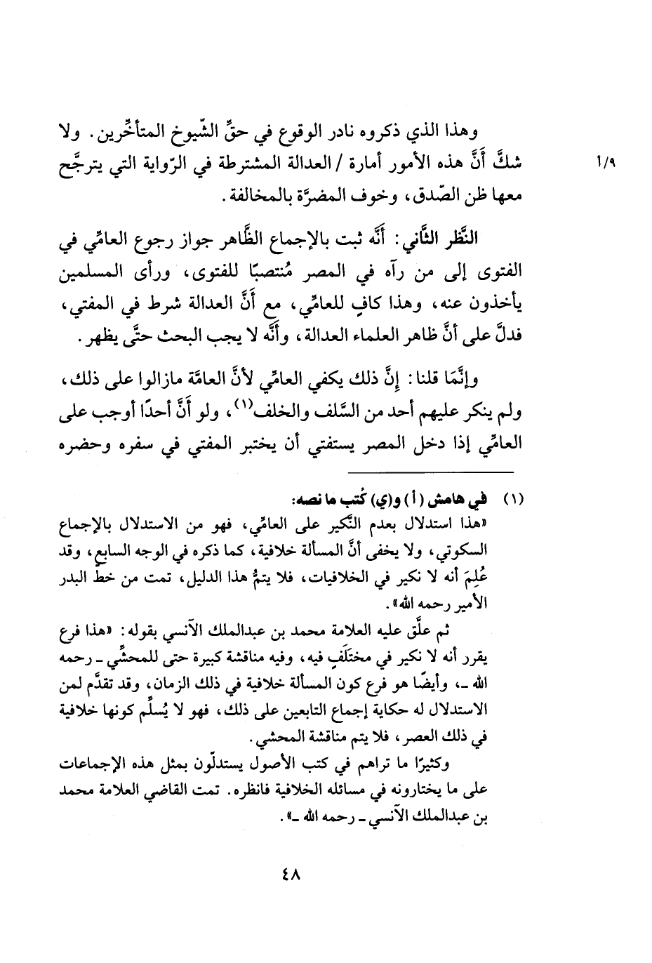 ((هذا استدلال بعدم النكير على العامّي, فهو من الاستدلال بالإجماع السكوتي, ولا يخفى أنّ المسألة خلافية, كما ذكره في الوجه السابع, وقد علم أنه لا نكير في الخلافيات, فلا يتم هذا الدليل, تمت من خط البدر الأمير رحمه الله)).