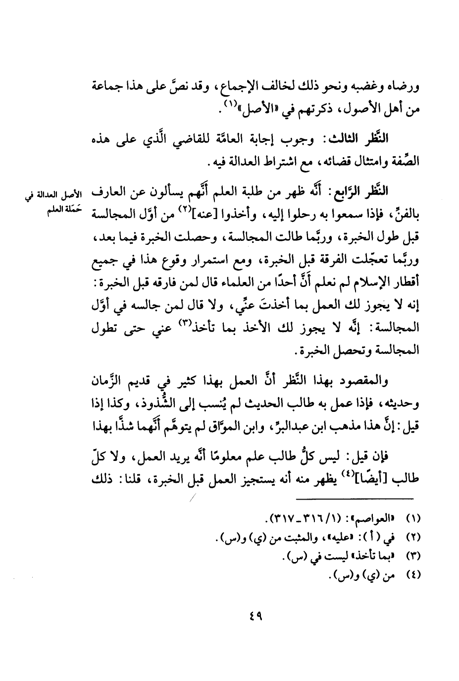 النظر الرابع: أنّه ظهر من طلبة العلم أنهم يسألون عن العارف بالفنّ, فإذا سمعوا به رحلوا إليه, وأخذوا [عنه] (¬2) من أوّل المجالسة قبل طول الخبرة, وربّما طالت المجالسة, وحصلت الخبرة فيما بعد, وربّما تعجّلت الفرقة قبل الخبرة, ومع استمرار وقوع هذا في جميع أقطار الإسلام لم نعلم أنّ أحداً من العلماء قال لمن فارقه قبل الخبرة: إنه لا يجوز لك العمل بما أخذت عنّي, ولا قال لمن جالسه في أوّل المجالسة: إنّه لا يجوز لك الأخذ بما تأخذ (¬3) عني حتى تطول المجالسة وتحصل الخبرة.
