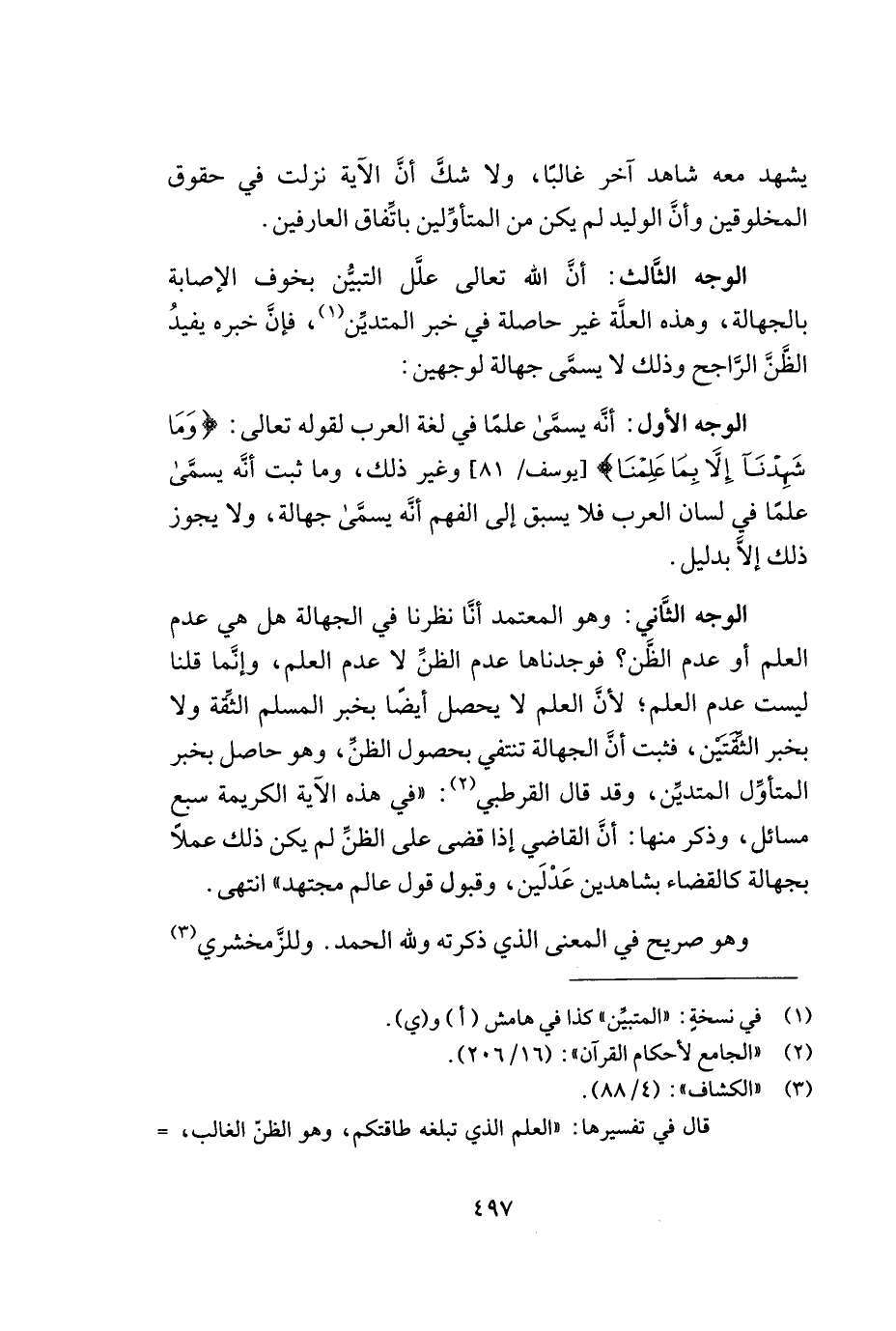 الوجه الثّاني: وهو المعتمد أنّا نظرنا في الجهالة هل هي عدم العلم أو عدم الظّنّ؟ فوجدناها عدم الظّنّ لا عدم العلم, وإنّما قلنا ليست عدم العلم؛ لأنّ العلم لا يحصل أيضاً بخبر المسلم الثّقة ولا بخبر الثّقتين, فثبت أنّ الجهالة تنتفي بحصول الظّنّ, وهو حاصل بخبر المتأوّل المتديّن, وقد قال القرطبي (¬2): ((في هذه الآية الكريمة سبع مسائل, وذكر منها: أنّ القاضي إذا قضى على الظّنّ لم يكن ذلك عملاً بجهالة كالقضاء بشاهدين عدلين, وقبول قول عالم مجتهد)) انتهى.