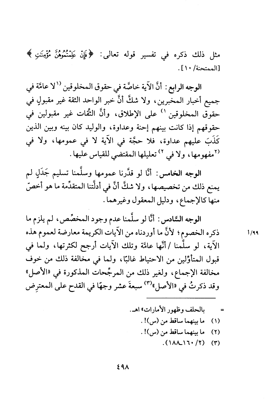 الوجه السّادس: أنّا لو سلّمنا عدم وجود المخصّص, لم يلزم ما ذكره الخصوم؛ لأنّ ما أوردناه من الآيات الكريمة معارضة لعموم هذه الآية, لو سلّمنا /أنّها عامّة وتلك الآيات أرجح لكثرتها, ولما في قبول المتأوّلين من الاحتياط غالباً, ولما في مخالفة ذلك من خوف مخالفة الإجماع, ولغير ذلك من المرجّحات المذكورة في ((الأصل)) وقد ذكرت في ((الأصل)) (¬3) سبعة عشر وجهاً في القدح على المعترض