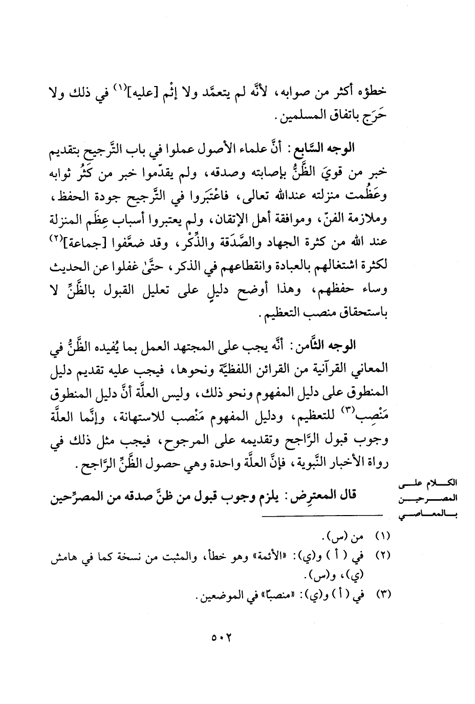 الوجه الثّامن: أنّه يجب على المجتهد العمل بما يُفيده الظّنّ في المعاني القرآنية اللفظيّة ونحوها, فيجب عليه تقديم دليل المنطوق على دليل المفهوم ونحو ذلك, وليس العلّة أنّ دليل المنطوق منصب (¬3) للتعظيم, ودليل المفهوم منصب للاستهانة, وإنّما العلّة وجوب قبول الرّاجح وتقديمه على المرجوح, فيجب مثل ذلك في رواة الأخبار النّبويّة, فإنّ العلّة واحدة وهي حصول الظّنّ الرّاجح.