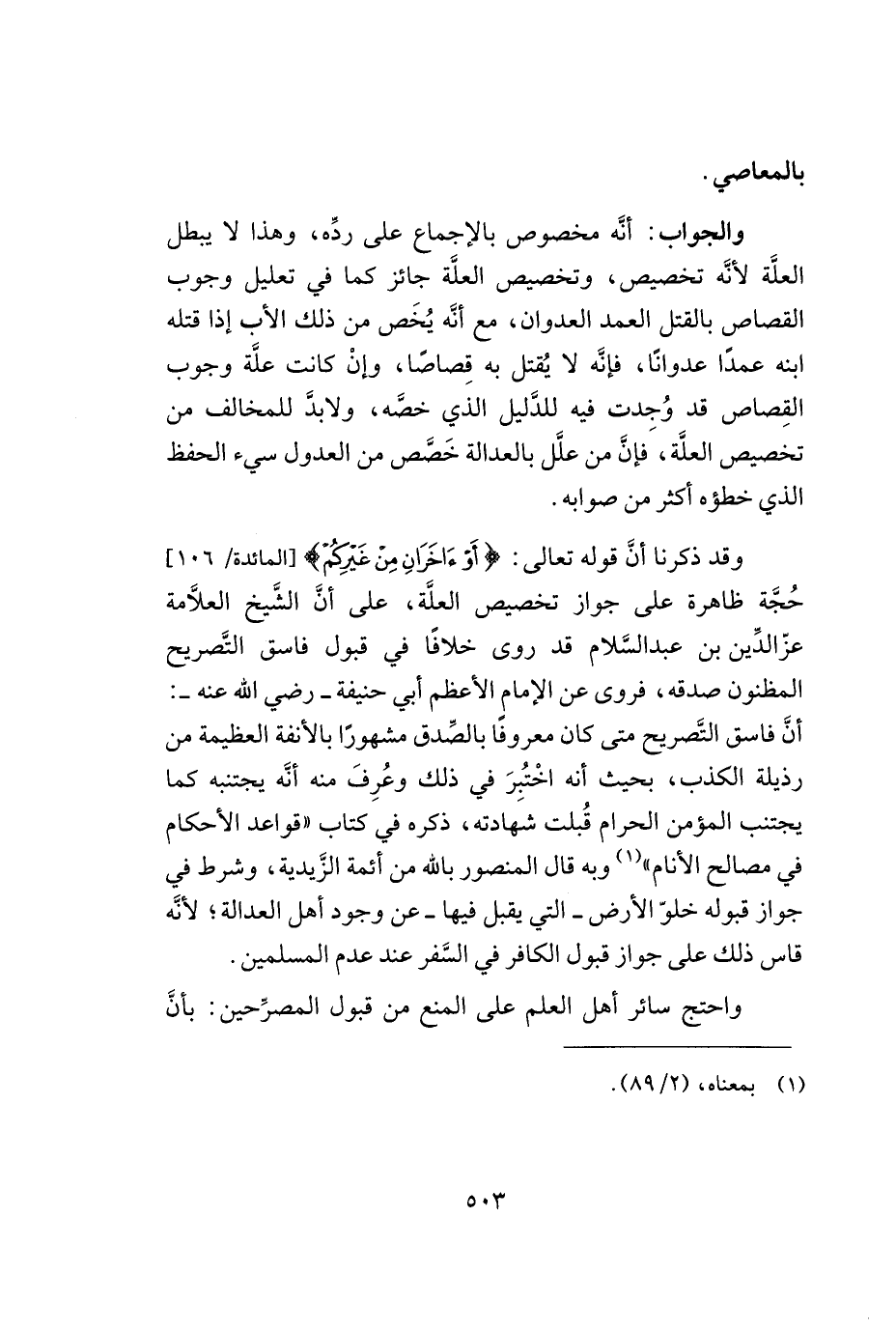 وقد ذكرنا أنّ قوله تعالى: ((أو آخران من غيركم)) [المائدة/106] حجّة ظاهرة على جواز تخصيص العلّة, على أنّ الشّيخ العلامة عزّ الدّين بن عبد السّلام قد روى خلافاً في قبول فاسق التّصريح المظنون صدقه, فروى عن الإمام الأعظم أبي حنيفة - رضي الله عنه -: أنّ فاسق التّصريح متى كان معروفاً بالصّدق مشهوراً بالأنفة العظيمة من رذيلة الكذب, بحيث أنه اختبر في ذلك وعرف منه أنّه يجتنبه كما يجتنب المؤمن الحرام قُبلت شهادته, ذكره في كتاب ((قواعد الأحكام في مصالح الأنام)) (¬1) وبه قال المنصور بالله من أئمة الزّيديّة, وشرط في جواز قبوله خلوّ الأرض -التي يقبل فيها- عن وجود أهل العدالة؛ لأنّه قاس ذلك على جواز قبول الكافر في السّفر عند عدم المسلمين.