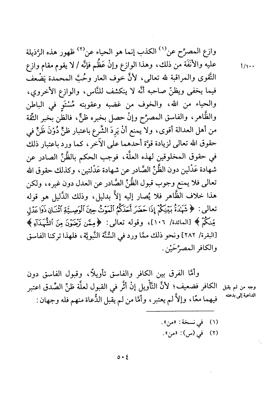 وازع المصرّح عن (¬1) الكذب إنّما هو الحياء عن (¬2) ظهور هذه الرّذيلة عليه والأنفة من ذلك, وهذا الوازع وإن عظم فإنّه /لا يقوم مقام وازع التّقوى والمراقبة لله تعالى, لأنّ خوف العار وحبّ المحمدة يضعف فيما يخفى ويظنّ صاحبه أنّه لا ينكشف للنّاس, والوازع الأخروي, والحياء من الله, والخوف من غضبه وعقوبته مستو في الباطن والظّاهر, والفاسق المصرّح وإن حصل بخبره ظنّ, فالظّنّ بخبر الثّقة من أهل العدالة أقوى, ولا يمنع أن يرد الشّرع باعتبار ظنّ دون ظنّ في حقوق الله تعالى لزيادة قوّة أحدهما على الآخر, كما ورد باعتبار ذلك في حقوق المخلوقين لهذه العلّة, فوجب الحكم بالظّنّ الصادر عن شهادة عدلين دون الظّنّ الصّادر عن شهادة عدلتين, وكذلك حقوق الله تعالى فلا يمنع وجوب قبول الظّنّ الصّادر عن العدل دون غيره, ولكن هذا خلاف الظّاهر فلا يصار إليه إلا بدليل, وذلك الدّليل هو قوله تعالى: ((شهادة بينكم إذا حضر أحدكم الموت حين الوصية اثنان ذوا عدل منكم)) [المائدة/106] , وقوله تعالى: ((ممّن ترضون من الشهداء)) [البقرة/282] ونحو ذلك ممّا ورد في السّنّة النّبويّة, فلهذا تركنا الفاسق والكافر المصرّحين.