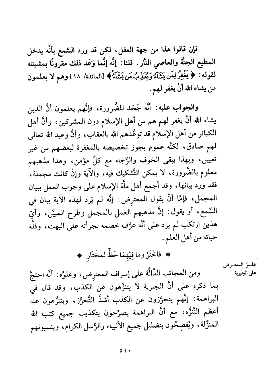 والجواب عليه: أنّه جحد للضّرورة, فإنّهم يعلمون أنّ الذين يشاء الله أن يغفر لهم هم من أهل الإسلام دون المشركين, وأنّ أهل الكبائر من أهل الإسلام قد توعّدهم الله بالعقاب, وأنّ وعيد الله تعالى لهم صادق, لكنّه عموم يجوز تخصيصه بالمغفرة لبعضهم من غير تعيين, وبهذا يبقى الخوف والرّجاء مع كلّ مؤمن, وهذا مذهبهم معلوم بالضّرورة, لا يمكن التّشكيك فيه, والآية وإن كانت مجملة, فقد ورد بيانها, وقد أجمع أهل ملّة الإسلام على وجوب العمل ببيان المجمل, فإمّا أن يقول المعترض: إنّه لم يرد لهذه الآية بيان في السّمع, أو يقول: إنّ مذهبهم العمل بالمجمل وطرح المبيّن, وأيّ هذين ارتكب لم يزد على أنّه عرّف خصمه بجرأته على البهت, وقلّة حيائه من أهل العلم.