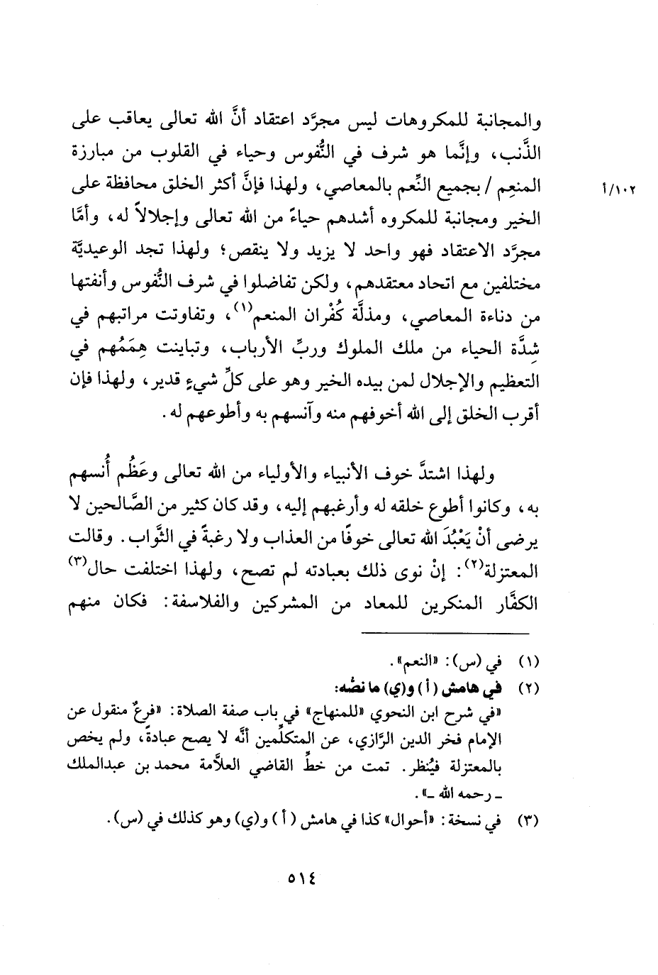 والمجانبة للمكروهات ليس مجرّد اعتقاد أنّ الله تعالى يعاقب على الذّنب, وإنّما هو شرف في النّفوس وحياء في القلوب من مبارزة المنعم /بجميع النّعم بالمعاصي, ولهذا فإنّ أكثر الخلق محافظة على الخير ومجانبة للمكروه أشدهم حياء من الله تعالى وإجلالاً له, وأمّا مجرّد الاعتقاد فهو واحد لا يزيد ولا ينقص؛ ولهذا تجد الوعيديّة مختلفين مع اتحاد معتقدهم, ولكن تفاضلوا في شرف النّفوس وأنفتها من دناءة المعاصي, ومذلّة كفران المنعم (¬1) , وتفاوتت مراتبهم في شدّة الحياء من ملك الملوك وربّ الأرباب, وتباينت هممهم في التعظيم والإجلال لمن بيده الخير وهو على كلّ شيء قدير, ولهذا فإن أقرب الخلق إلى الله أخوفهم منه وآنسهم به وأطوعهم له.
