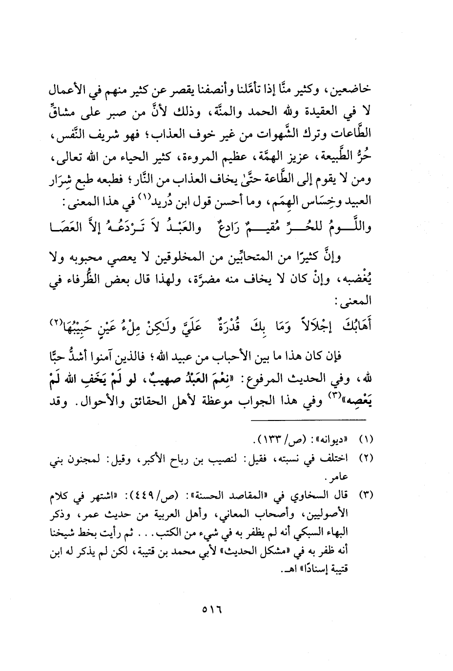 خاضعين, وكثير منّا إذا تأملّنا وأنصفنا يقصر عن كثير منهم في الأعمال لا في العقيدة ولله الحمد والمنّة, وذلك لأنّ من صبر على مشاقّ الطّاعات وترك الشّهوات من غير خوف العذاب؛ فهو شريف النّفس, حرّ الطّبيعة, عزيز الهمّة, عظيم المروءة, كثير الحياء من الله تعالى, ومن لا يقوم إلى الطّاعة حتّى يخاف العذاب من النّار؛ فطبعه طبع شرار العبيد وخساس الهمم, وما أحسن قول ابن دريد (¬1) في هذا المعنى: