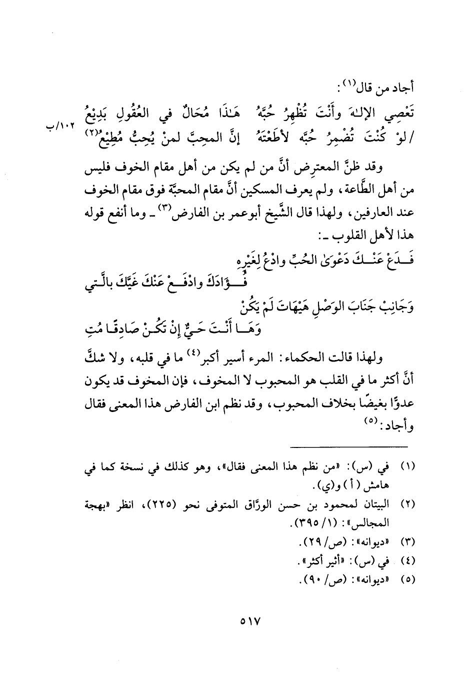 وقد ظنّ المعترض أنّ من لم يكن من أهل مقام الخوف فليس من أهل الطّاعة, ولم يعرف المسكين أنّ مقام المحبّة فوق مقام الخوف عند العارفين, ولهذا قال الشّيخ أبو عمر بن الفارض (¬3) -وما أنفع قوله هذا لأهل القلوب-: