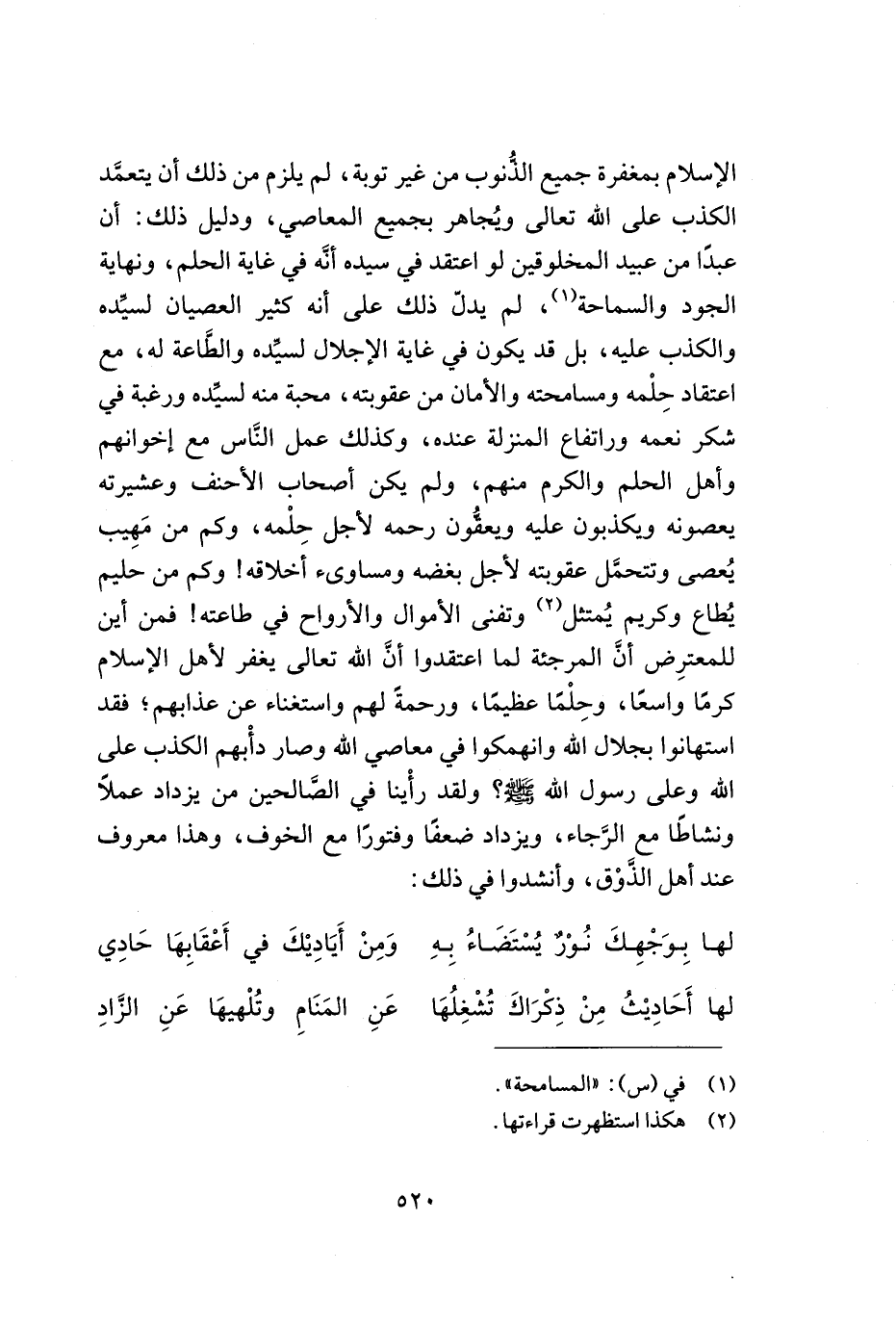الإسلام بمغفرة جميع الذّنوب من غير توبة, لم يلزم من ذلك أن يتعمّد الكذب على الله تعالى ويجاهر بجميع المعاصي, ودليل ذلك: أن عبداً من عبيد المخلوقين لو اعتقد في سيده أنّه في غاية الحلم, ونهاية الجود والسماحة (¬1) , لم يدلّ ذلك على أنه كثير العصيان لسيّده والكذب عليه, بل قد يكون في غاية الإجلال لسيّده والطّاعة له, مع اعتقاد حلمه ومسامحته والأمان من عقوبته, محبة منه لسيّده ورغبة في شكر نعمة وارتفاع المنزلة عنده, وكذلك عمل النّاس مع إخوانهم وأهل الحلم والكرم منهم, ولم يكن أصحاب الأحنف وعشيرته يعصونه ويكذبون عليه ويعفّون رحمه لأجل حلمه, وكم من مهيب يعصى وتتحمّل عقوبته لأجل بغضه ومساوىء أخلاقه! وكم من حليم يطاع وكريم يمتثل (¬2) وتفنى الأموال والأرواح في طاعته! فمن أين للمعترض أنّ المرجئة لما اعتقدوا أنّ الله تعالى يغفر لأهل الإسلام استهانوا بجلال الله وانهمكوا في معاصي الله وصار دأبهم الكذب على الله وعلى رسول الله - صلى الله عليه وسلم -؟ ولقد رأينا في الصّالحين من يزداد عملاً ونشاطاً مع الرّجاء, ويزداد ضعفاً وفتوراً مع الخوف, وهذا معروف عند أهل الذّوق, وأنشدوا في ذلك: