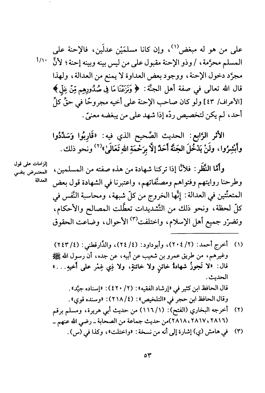 وأما النّظر: فلأنّا إذا تركنا شهادة من هذه صفته من المسلمين, وطرحنا روايتهم وفتواهم ومصنّفاتهم, واعتبرنا في الشهادة قول بعض المتعنّتين في العدالة: إنّها الخروج من كلّ شبهة, ومحاسبة النّفس في كلّ لحظة, ونحو ذلك من التّشديدات تعطّلت المصالح والأحكام, وتضرّر جميع أهل الإسلام, واختلفت (¬3) الأحوال, وضاعت الحقوق