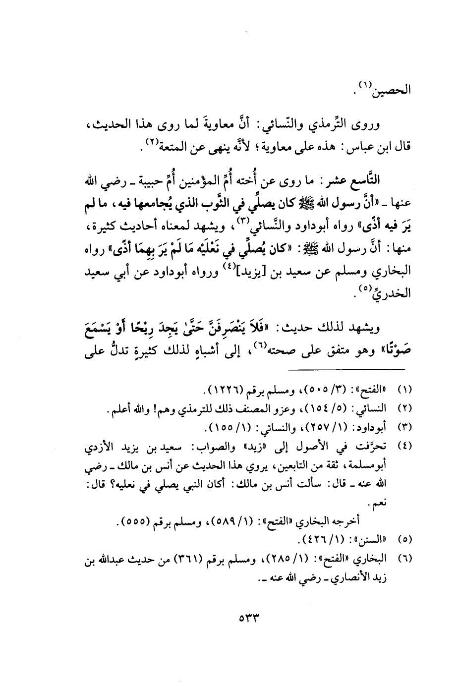التّاسع عشر: ما روى عن أخته أمّ المؤمنين أمّ حبيبة - رضي الله عنه - ((أنّ رسول الله - صلى الله عليه وسلم - كان يصلّي في الثّوب الذي يجامعها فيه, ما لم ير فيه أذى)) رواه أبو داود والنّسائي (¬3) , ويشهد لمعناه أحاديث كثيرة, منها: أنّ رسول الله - صلى الله عليه وسلم -: ((كان يصلّي في نعليه ما لم ير بهما أذى)) رواه البخاري ومسلم عن سعيد بن [يزيد] (¬4) ورواه أبو داود عن أبي سعيد الخدري (¬5).