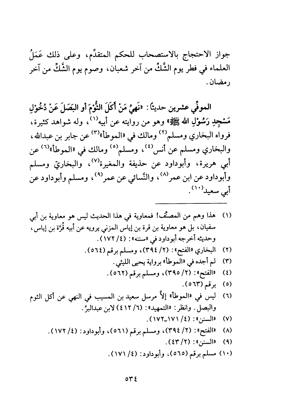 الموفّي عشرين حديثاً: ((نهي من أكل الثّوم أو البصل عن دخول مسجد رسول الله - صلى الله عليه وسلم -)) وهو من روايته عن أبيه (¬1) , وله شواهد كثيرة, فرواه البخاري ومسلم (¬2) ومالك في ((الموطأ)) (¬3) عن جابر بن عبد الله, والبخاري ومسلم عن أنس (¬4) , ومسلم (¬5) ومالك في ((الموطأ)) (¬6) عن أبي هريرة, وأبو داود عن حذيفة والمغيرة (¬7) , والبخاريّ ومسلم وأبو داود عن ابن عمر (¬8) , والنّسائي عن عمر (¬9) , مسلم وأبو داود عن أبي سعيد (¬10).