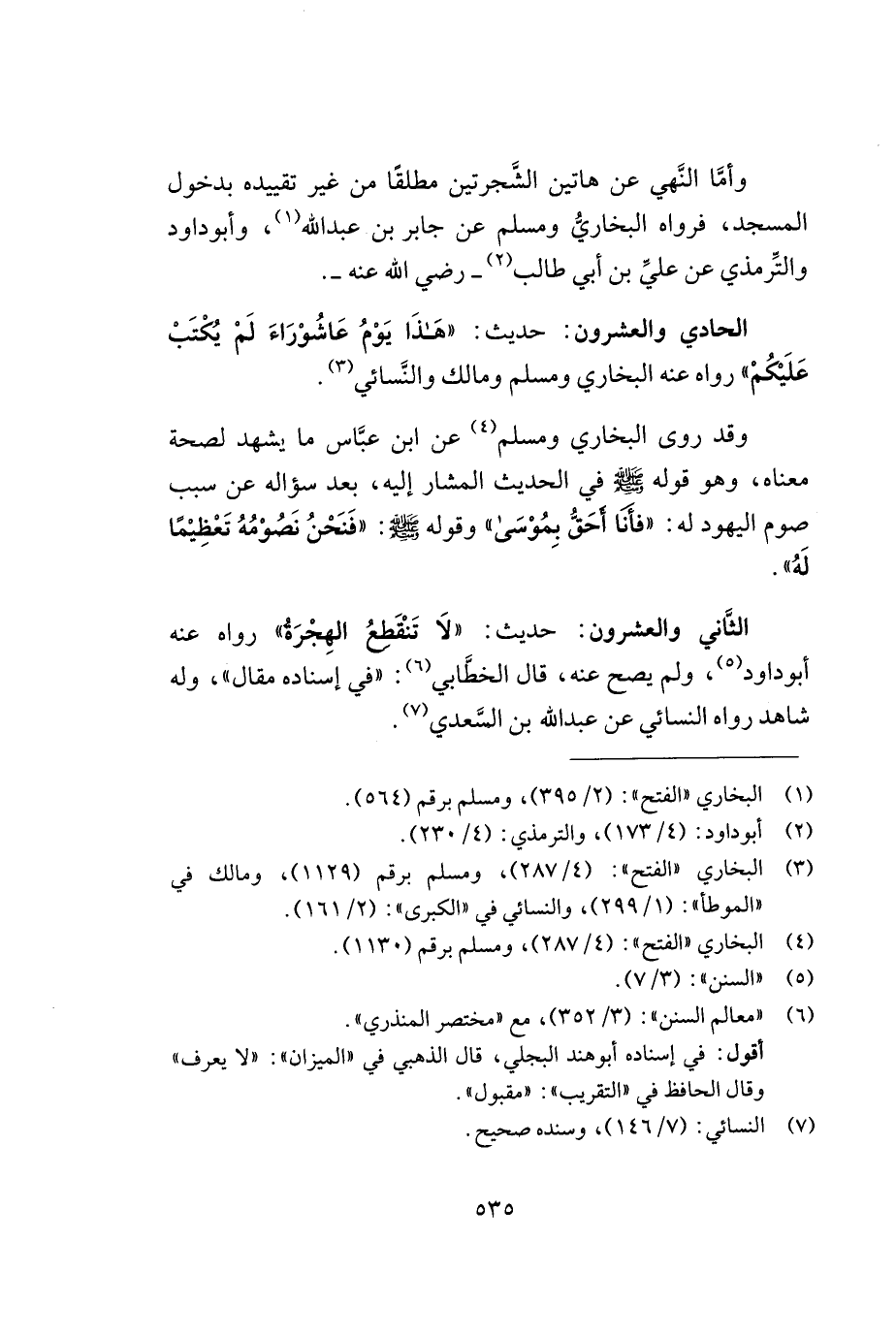 الثاني والعشرون: حديث: ((لا تنقطع الهجرة)) رواه عنه أبو داود (¬5) , ولم يصح عنه, قال الخطّابي (¬6): ((في إسناده مقال)) , وله شاهد رواه النسائي عن عبد الله بن السّعدي (¬7).