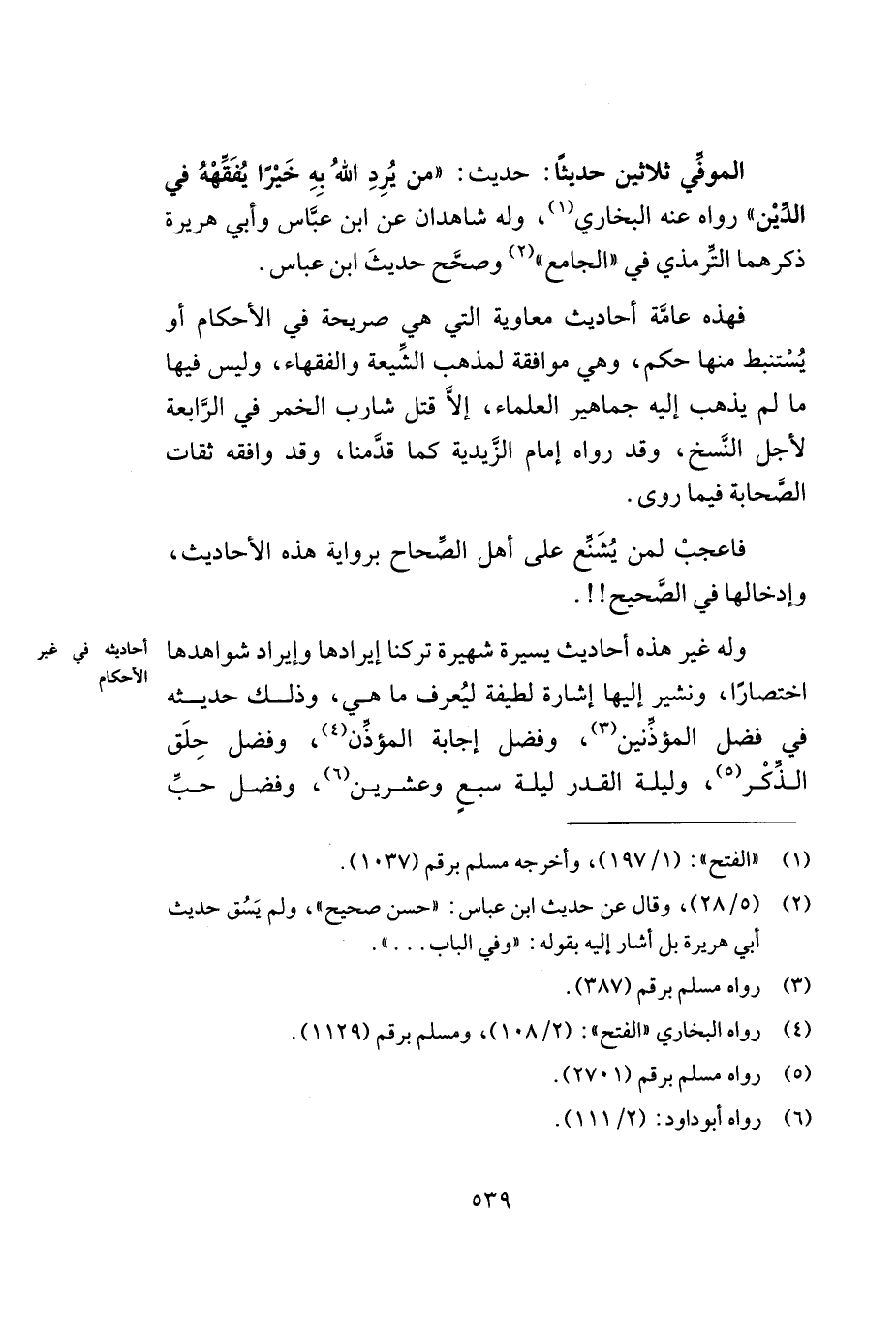 الموفّي ثلاثين حديثاً: حديث: ((من يرد الله به خيراً يفقّهه في الدّين)) رواه عنه البخاري (¬1) , وله شاهدان عن ابن عبّاس وأبي هريرة ذكرهما التّرمذي في ((الجامع)) (¬2) وصحّح حديث ابن عباس.