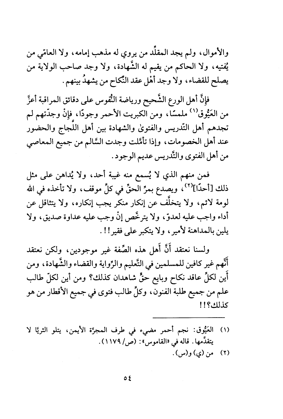ولسنا نعتقد أنّ أهل هذه الصّفة غير موجودين, ولكن نعتقد أنّهم غير كافين للمسلمين في التّعليم والرّواية والقضاء والشّهادة, ومن أين لكلّ عاقد نكاح وبايع حقّ شاهدان كذلك؟ ومن أين لكلّ طالب علم من جميع طلبة الفنون, وكلّ طالب فتوى في جميع الأقطار من هو كذلك؟!!.