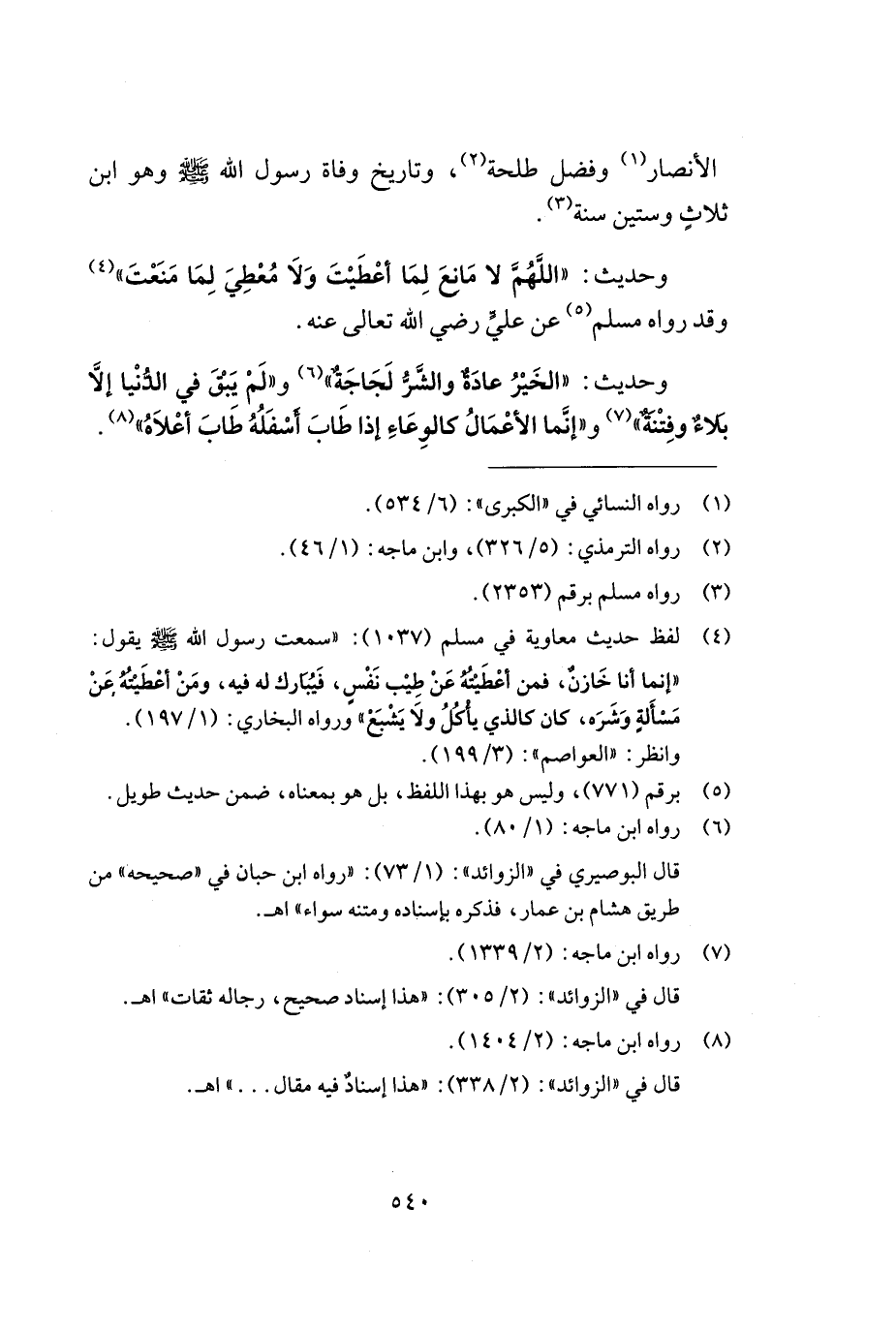 الأنصار (¬1) وفضل طلحة (¬2) , وتاريخ وفاة رسول الله - صلى الله عليه وسلم - وهو ابن ثلاث وستين سنة (¬3).