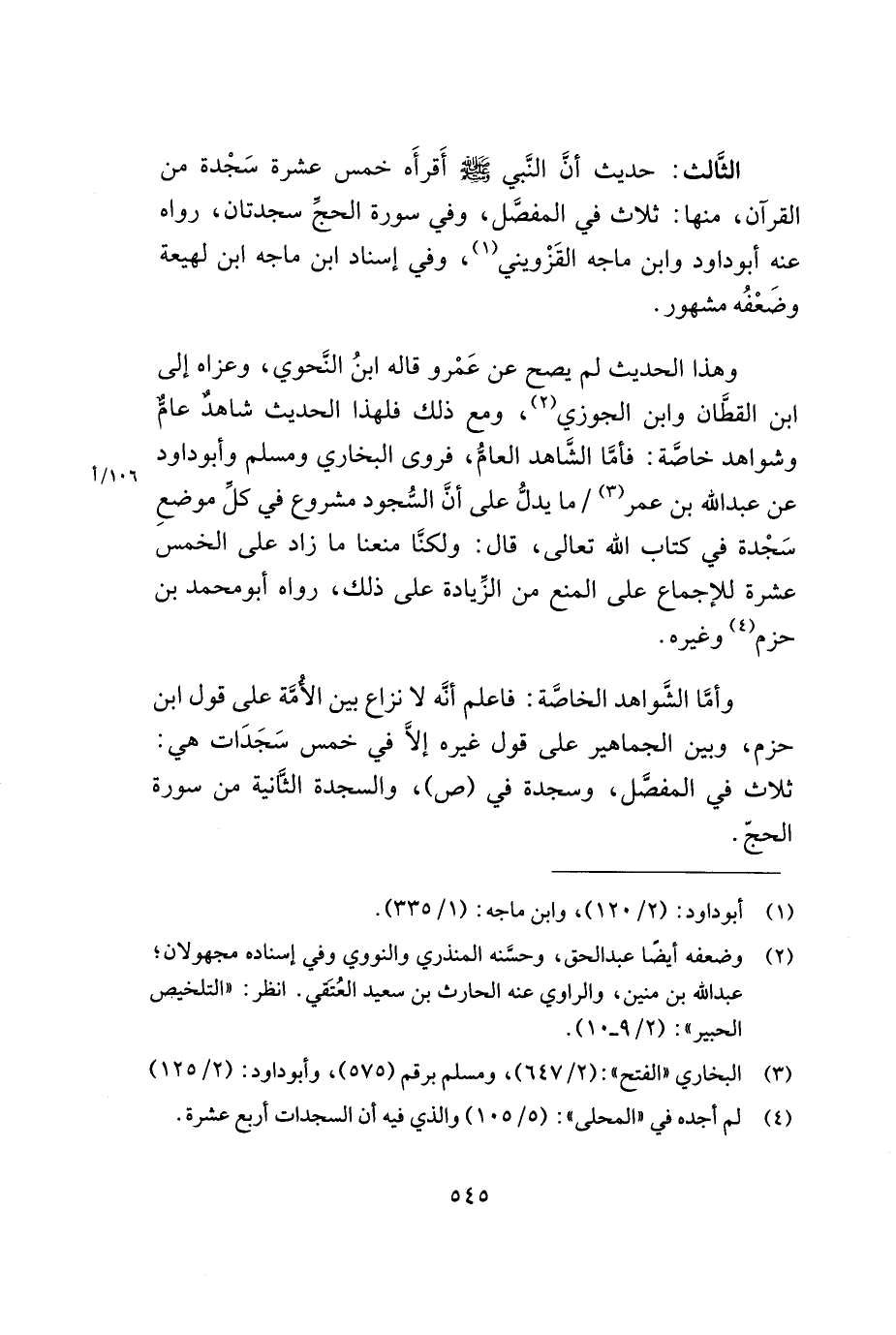 وأمّا الشّواهد الخاصّة: فاعلم أنّه لا نزاع بين الأمّة على قول ابن حزم, وبين الجماهير على قول غيره إلا في خمس سجدات هي: ثلاث في المفصّل, وسجدة في (ص) , والسجدة الثّانية من سورة الحجّ.