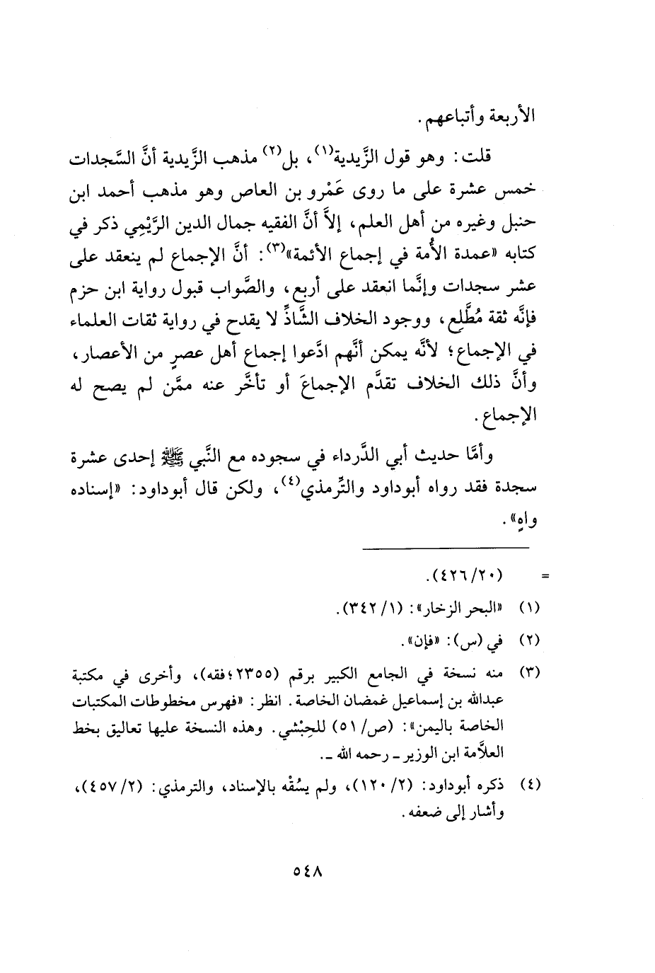 قلت: وهو قول الزّيدية (¬1) , بل (¬2) مذهب الزّيدية أنّ السّجدات خمس عشرة على ما روى عمرو بن العاص وهو مذهب أحمد ابن حنبل وغيره من أهل العلم, إلا أنّ الفقيه جمال الدين الرّيمي ذكر في كتابه ((عمدة الأمّة في إجماع الأئمة)) (¬3): أنّ الإجماع لم ينعقد على عشر سجدات وإنّما انعقد على أربع, والصّواب قبول رواية ابن حزم فإنّه ثقة مُطّلع, ووجود الخلاف الشّاذّ لا يقدح في رواية ثقات العلماء في الإجماع؛ لأنّه يمكن أنّهم ادّعوا إجماع أهل عصر من الأعصار, وأنّ ذلك الخلاف تقدّم الإجماع أو تأخّر عنه ممّن لم يصحّ له الإجماع.