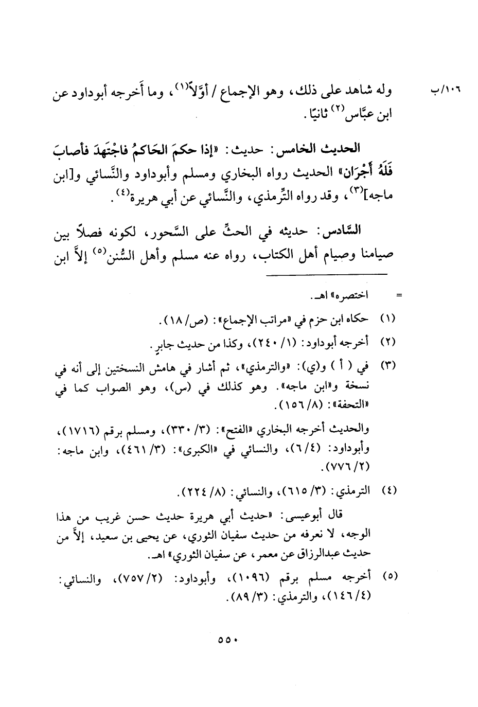 الحديث الخامس: حديث: ((إذا حكم الحاكم فاجتهد فأصاب فله أجران)) الحديث رواه البخاري ومسلم وأبو داود والنّسائي و [ابن ماجه] (¬3) , وقد رواه التّرمذي, والنّسائي عن أبي هريرة (¬4).
