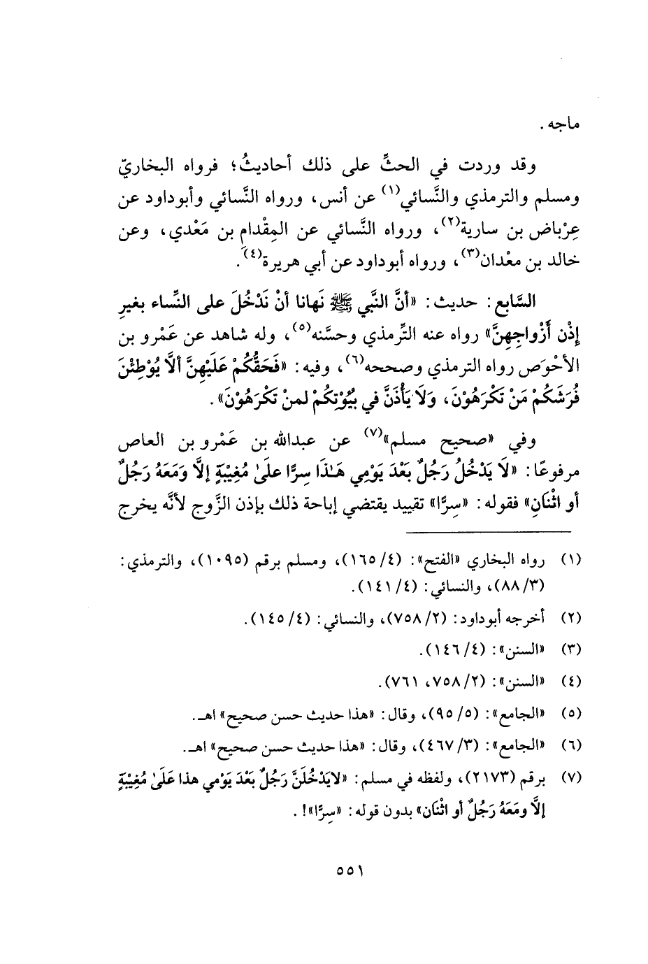 السّابع: حديث: ((أنّ النّبي - صلى الله عليه وسلم - نهانا أن ندخل على النّساء بغير إذن أزواجهنّ)) رواه عنه التّرمذي وحسّنه (¬5) , وله شاهد عن عمرو بن الأحوص رواه الترمذي وصححه (¬6) , وفيه: ((فحقّكم عليهنّ ألا يوطئن فرشكم من تكرهون, ولا يأذن في بيوتكم لمن تكرهون)).