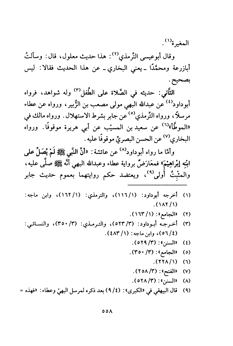 (¬9) قال البيهقي في ((الكبرى)): (4/ 9) بعد ذكره لمرسل البهيّ وعطاء: ((فهذه الآثار وإن كانت مراسيل, فهي تشد الموصول قبله, وبعضها يشدّ بعضاً, وقد أثبتوا صلاة رسول الله - صلى الله عليه وسلم - على ابنه إبراهيم, وذلك أولى من رواية من روى أنه لم يصلّ عليه)) اهـ.
