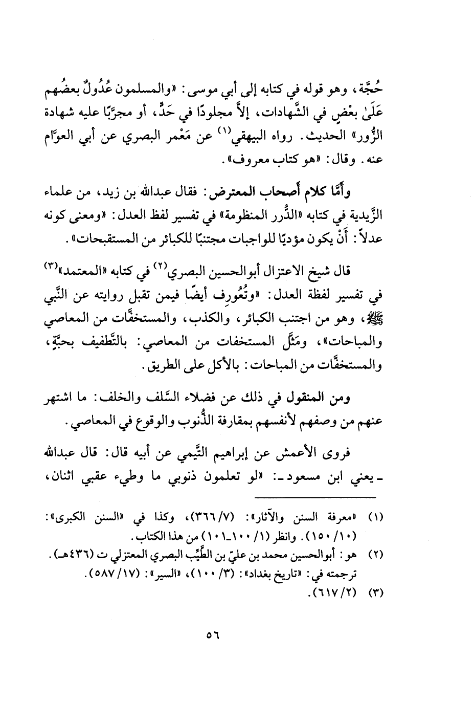 قال شيخ الاعتزال أبو الحسين البصري (¬2) في كتابه ((المعتمد)) (¬3) في تفسير لفظة العدل: ((وتعورف أيضاً فيمن تقبل روايته عن النّبي - صلى الله عليه وسلم - , وهو من اجتنب الكبائر, والكذب, والمستخفّات من المعاصي والمباحثات)) , ومثّل المستخفات من المعاصي: بالتّطفيف بحبّة, والمستخفّات من المباحات: بالأكل على الطريق.