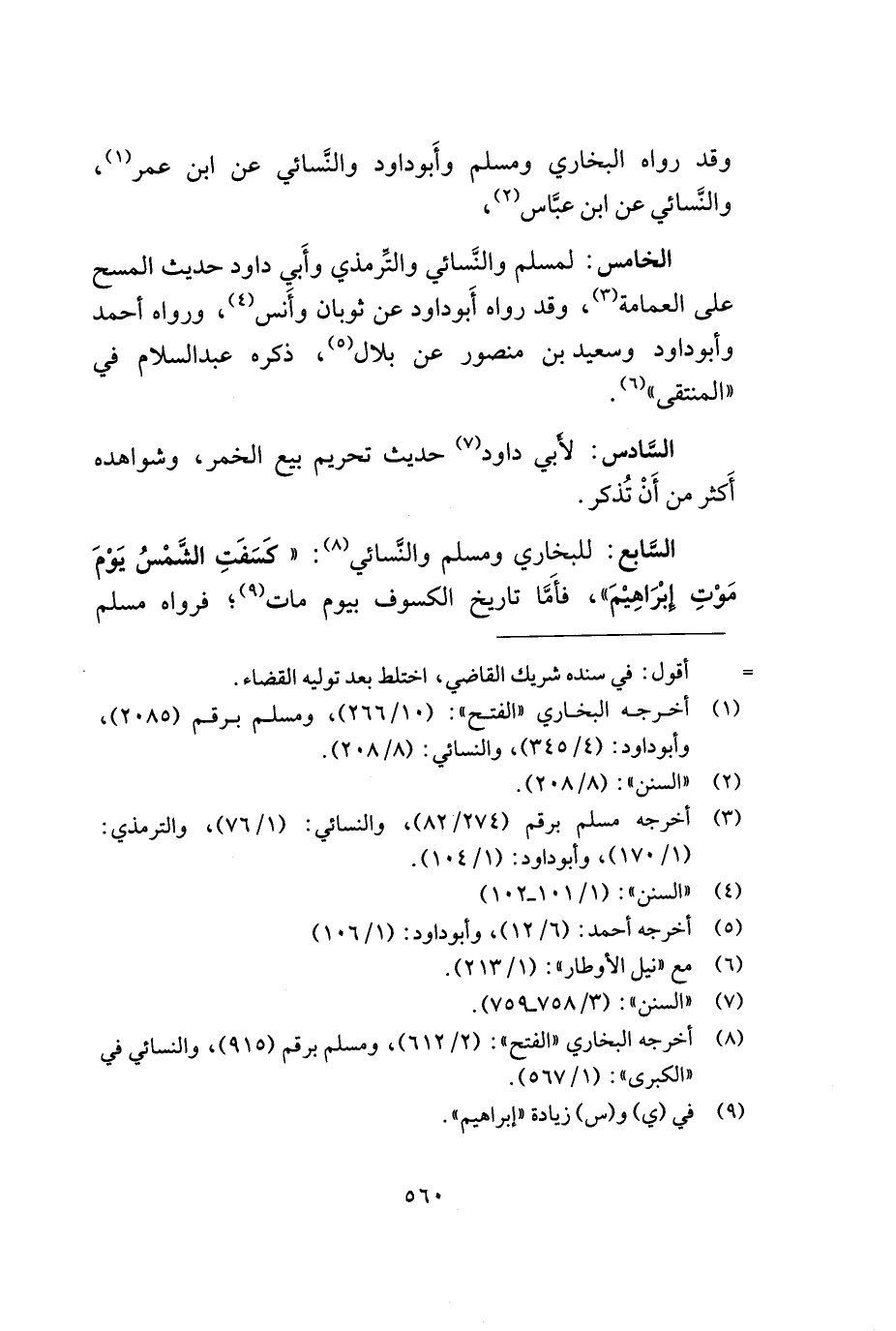 الخامس: لمسلم والنّسائي والتّرمذي وأبي داود حديث المسح على العمامة (¬3) , وقد رواه أبو داود عن ثوبان وأنس (¬4) , ورواه أحمد وأبو داود وسعيد بن منصور عن بلال (¬5) , ذكره عبد السلام في ((المنتقى)) (¬6).
