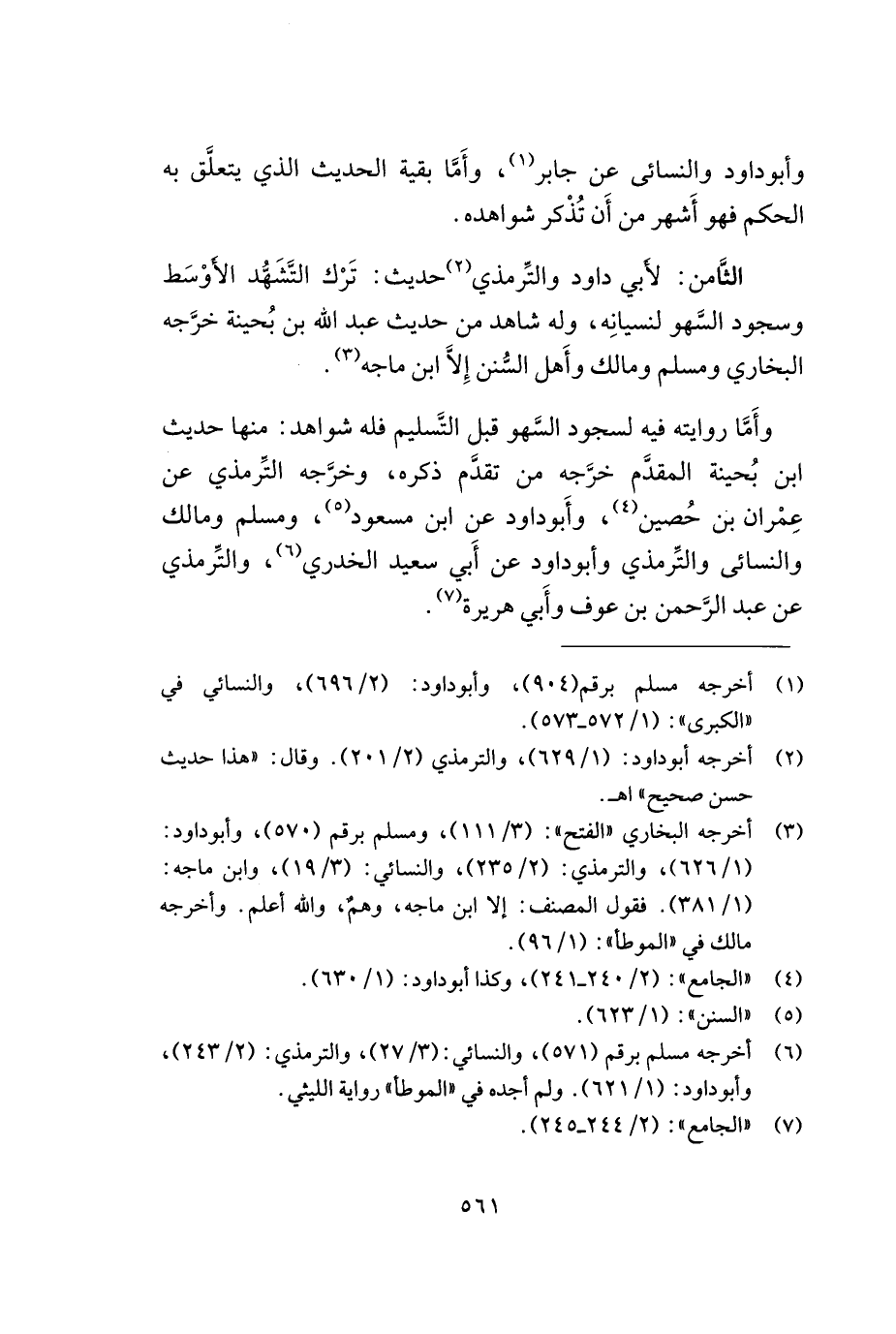 وأمّا روايته فيه لسجود السّهو قبل التّسليم فله شواهد: منها حديث ابن بحينة المقدّم خرجه من تقدّم ذكره, وخرّجه التّرمذي عن عمران بن حصين (¬4) , وأبو داود عن ابن مسعود (¬5) , ومسلم ومالك والنسائي والتّرمذي وأبو داود عن أبي سعيد الخدري (¬6) , والتّرمذي عن عبد الرّحمن بن عوف وأبي هريرة (¬7).