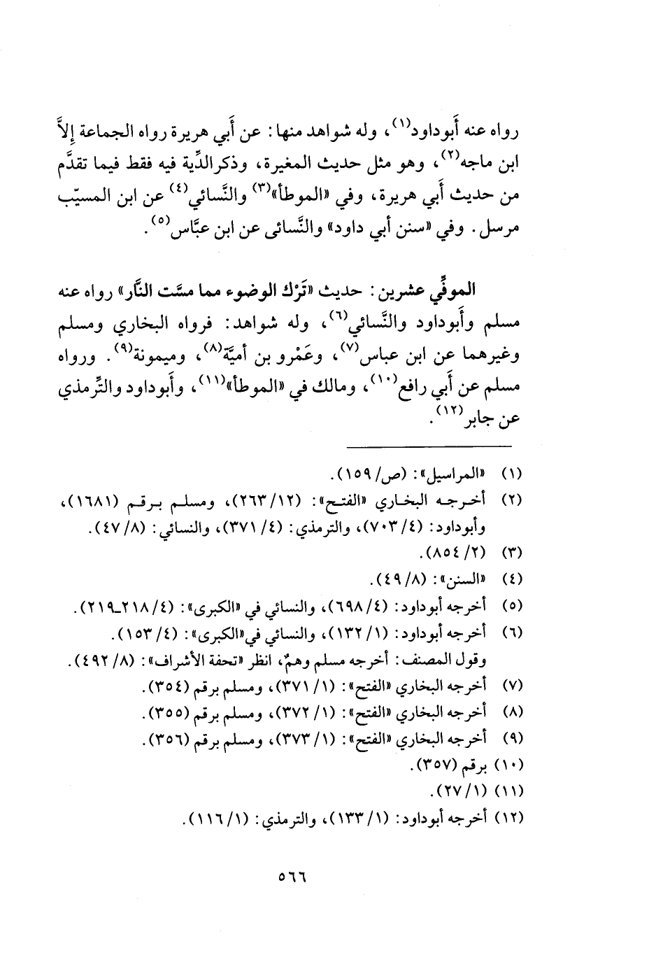 الموفّي عشرين: حديث: ((ترك الوضوء مما مسّت النّار)) رواه عنه مسلم وأبو داود والنّسائي (¬6) , وله شواهد: فرواه البخاري ومسلم وغيرهما عن ابن عبّاس (¬7) , وعمرو بن أميّة (¬8) , وميمونة (¬9). ورواه مسلم عن أبي رافع (¬10) , ومالك في ((الموطّأ)) (¬11) , وأبو داود والتّرمذي عن جابر (¬12).