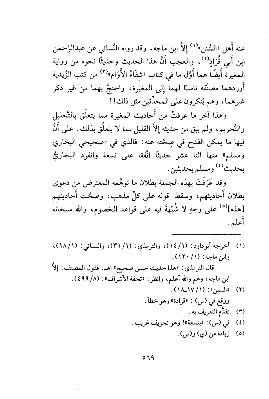 وهذا آخر ما عرفت من أحاديث المغيرة مما يتعلّق بالتّحليل والتّحريم, ولم يبق من حديثه إلا القليل مما يتعلّق بذلك. على أنّ فيها ما يمكن القدح في صحّته عنه: فالذي في ((صحيحي البخاري وملسم)) منها اثنا عشر حديثاً اتّفقا على تسعة وانفرد البخاريّ بحديث (¬4) ومسلم بحديثين.