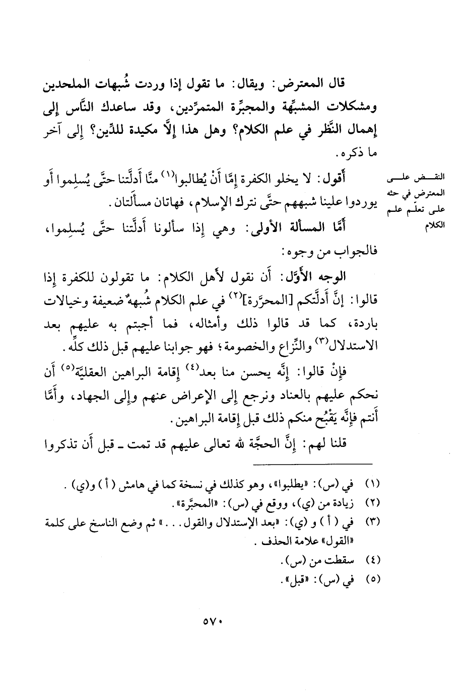 قال المعترض: ويقال: ما تقول إذا وردت شبهات الملحدين ومشكلات المشبّهة والمجبّرة المتمرّدين, وقد ساعدك النّاس إلى إهمال النّظر في علم الكلام؟ وهل هذا إلا مكيدة للّدين؟ إلى آخر ما ذكره.