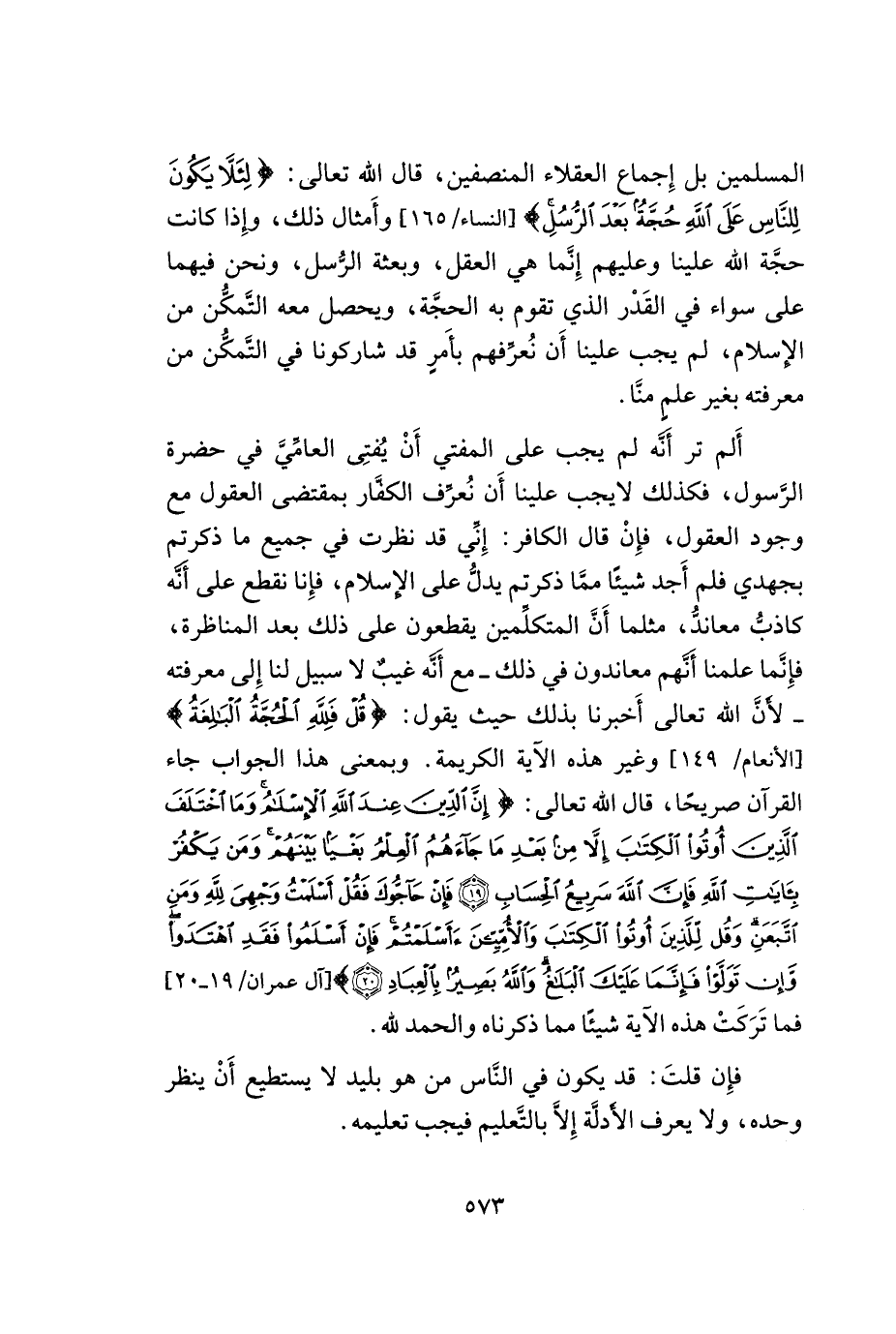 ألم تر أنّه لم يجب على المفتي أن يفتي العامّيّ في حضرة الرّسول, فكذلك لا يجب علينا أن نعرّف الكفّار بمقتضى العقول مع وجود العقول, فإن قال الكافر: إنّي قد نظرت في جميع ما ذكرتم بجهدي فلم أجد شيئاً ممّا ذكرتم يدلّ على الإسلام, فإنا نقطع على أنّه كاذب معاند, مثلما أنّ المتكلّمين يقطعون على ذلك بعد المناظرة, فإنّما علمنا أنّهم معاندون في ذلك -مع أنّه غيب لا سبيل لنا إلى معرفته- لأنّ الله تعالى أخبرنا بذلك حيث يقول: ((قل فلله الحجّة البالغة)) [الأنعام/149] وغير هذه الآية الكريمة. وبمعنى هذا الجواب جاء القرآن صريحاً, قال الله تعالى: ((إنّ الدّين عند الله الإسلام وما اختلف الذين أوتوا الكتاب إلا من بعد ما جاءهم العلم بغياً بينهم ومن يكفر بآيات الله فإن الله سريع الحساب, فإن حاجّوك فقل أسلمت وجهي لله ومن اتّبعن وقل للذين أوتوا الكتاب والأمّيين أأسلمتم فإن أسلموا فقد اهتدوا وإن تولّوا فإنّما عليك البلاغ والله بصير بالعباد)) [آل عمران/19 - 20] فما تركت هذه الآية شيئاً مما ذكرناه والحمد لله.